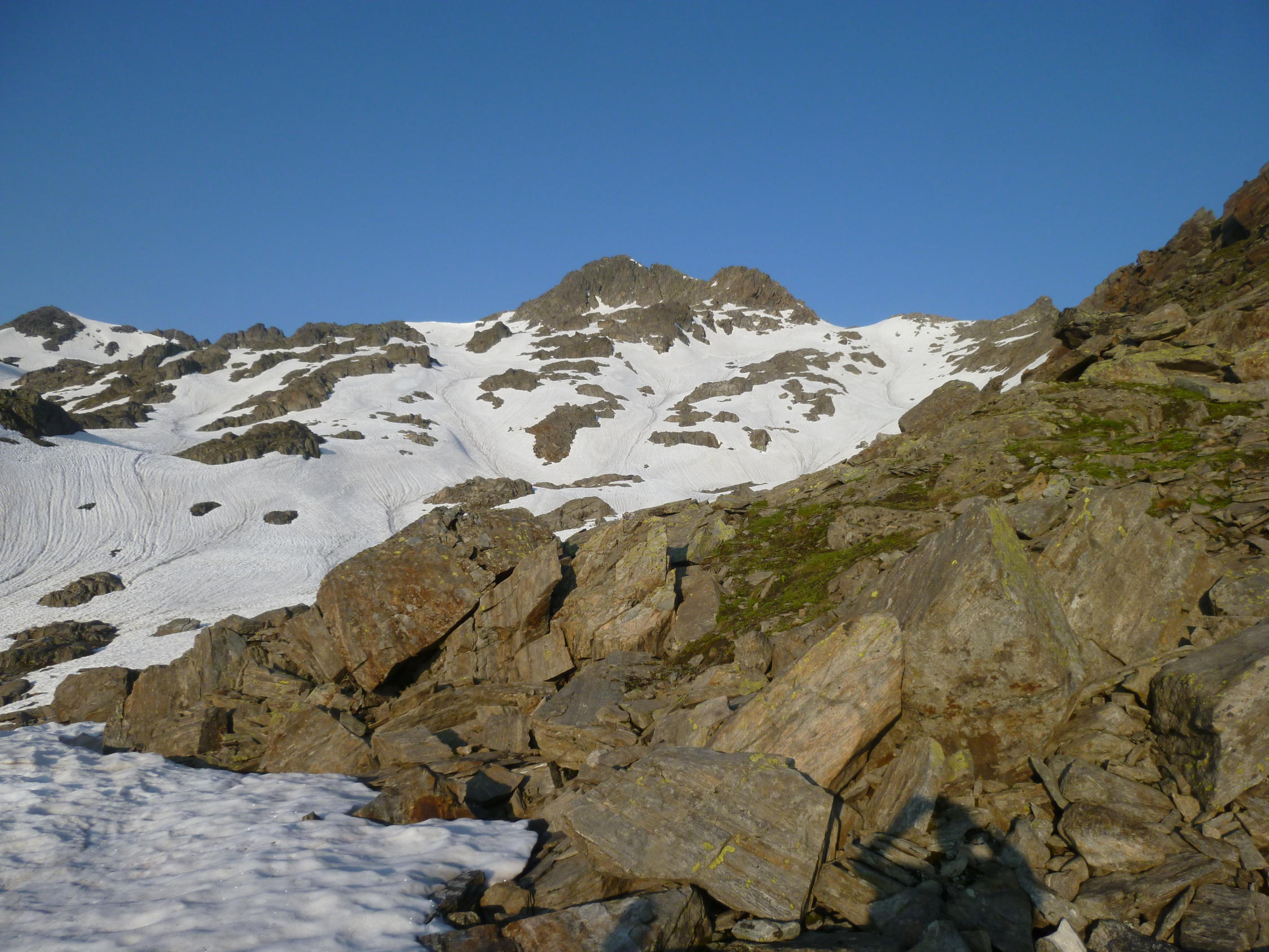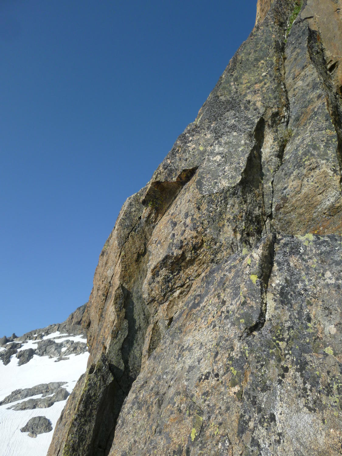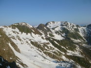 Der Ostgrat ist komplett schneefrei. Auf dem Grat noch einige Schneefelder, im Gipfelbereich Badus Six Madun Pickel nützlich. Ansonsten können viele Schneefelder auf der Gratkante im Fels umgangen werden, dort aber immer wieder IIer Kletterstellen.