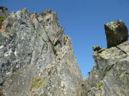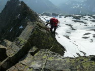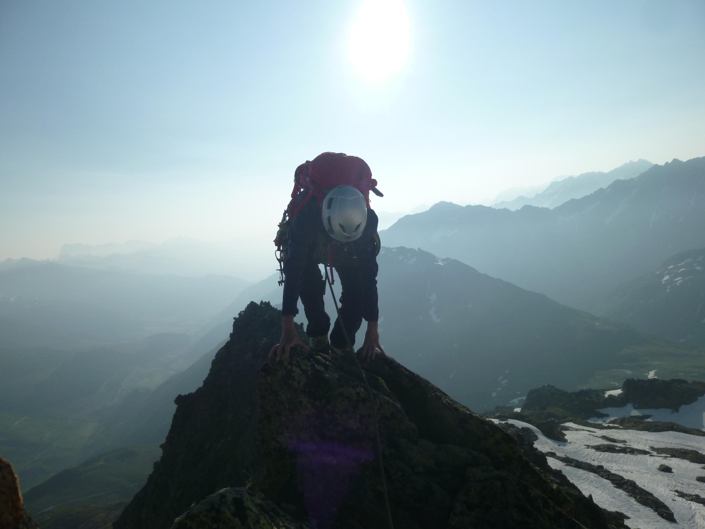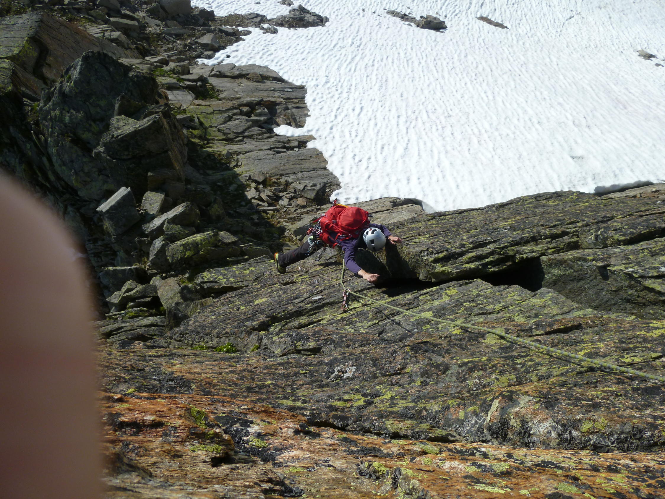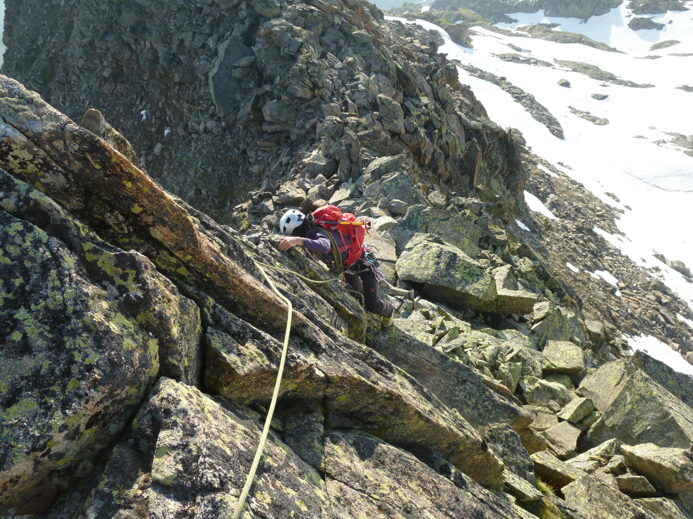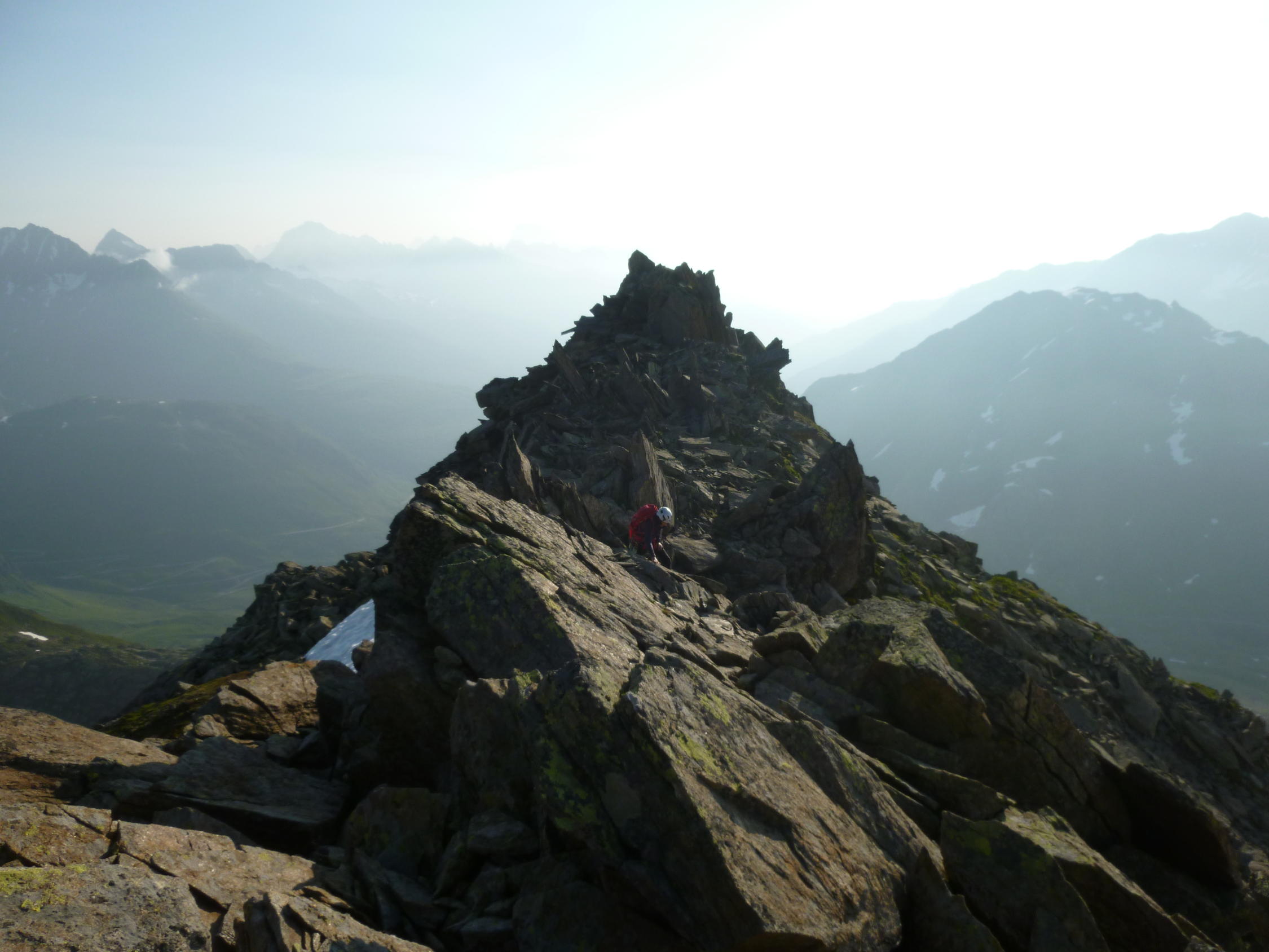 Schwierigkeit: über weite Strecken geschätzt T5/T6. Am Ostgrat weite Strecken im IIIer Bereich. Schlüsselstelle eine IV+