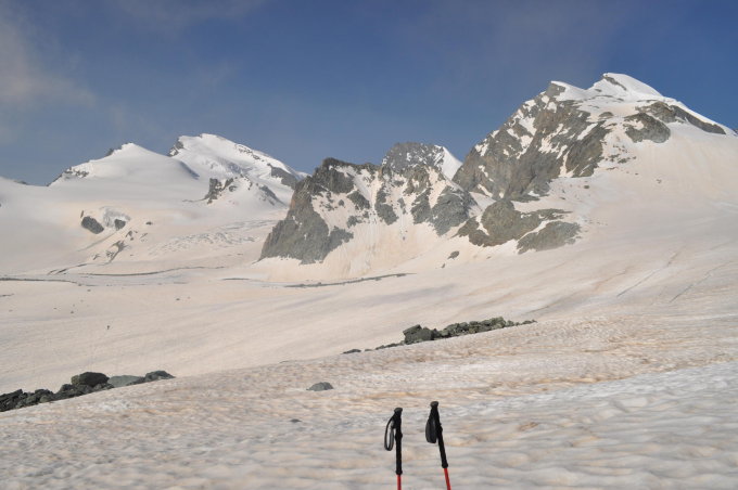 Gletscher trägt auch noch später am Tage sehr gut, da es aktuell noch recht kühl bleibt. Der Grad ist sehr gut verfirnt. Außergewöhnlich für die fortgeschrittene Jahreszeit. Oben im Fels hat es noch Schnee. Abstieg unproblematisch und schnell.