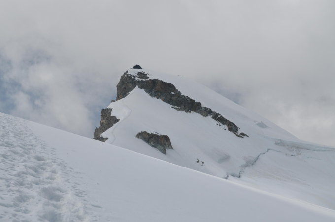 Wir sind erst spät von der Britannia-Hütte gestartet, da wir mit der Bahn von Saas Fee kamen. Der Gletscher hat gut getragen. Im unteren Bereich des Hohlaubgrates sind wir manchmal knietief eingebrochen. Weiter oben ging es prima. Wir waren den gesamten Aufstieg allein auf dem Grat unterwegs. Um 16.00 Uhr waren wir ebenfalls alleine auf dem Gipfel. Wetter war toll!