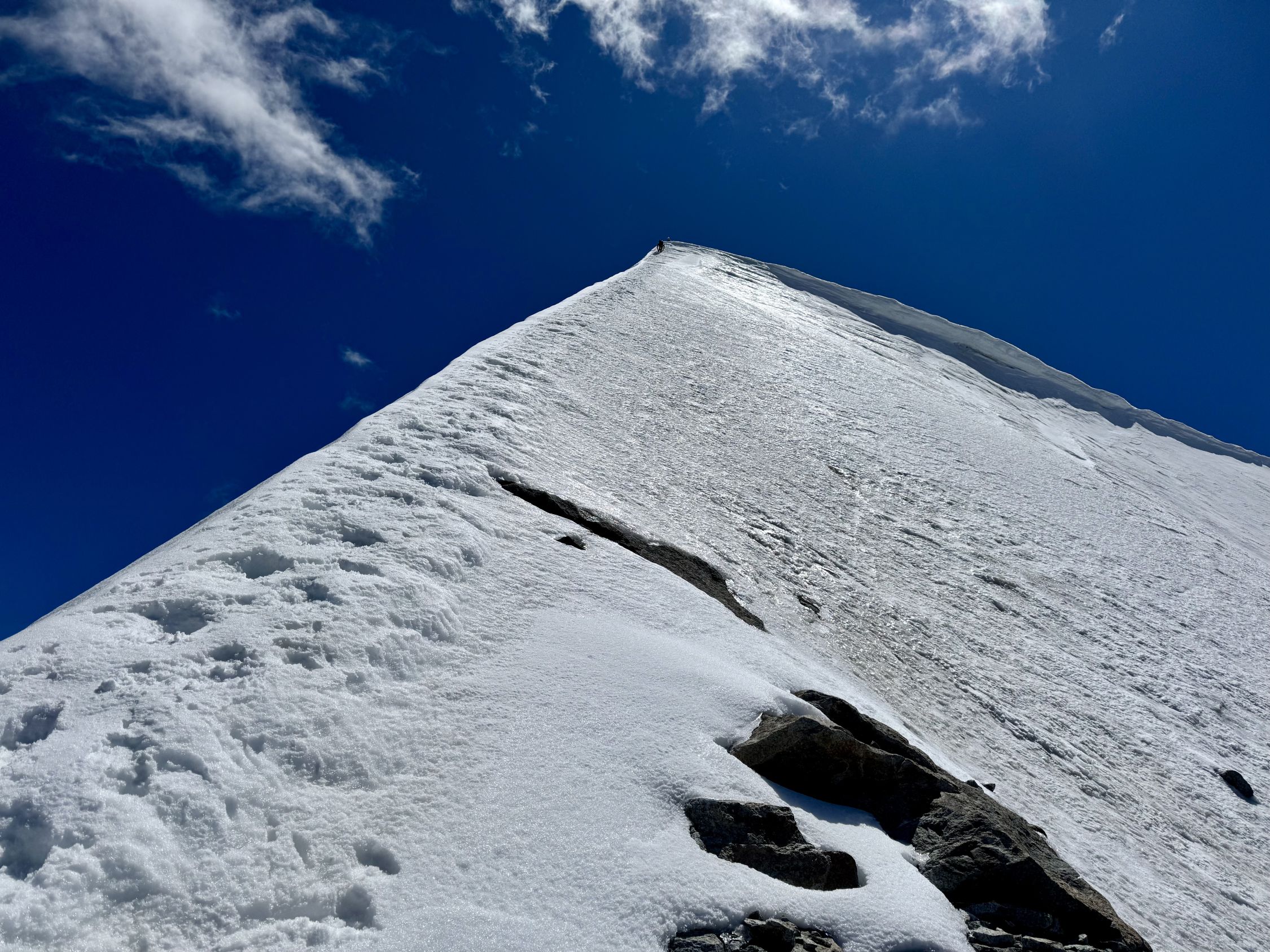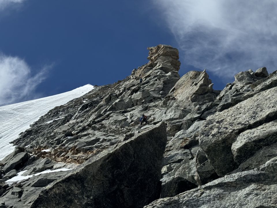 Zustieg über Normalweg gut, wenig Spalten. Bergschrund gut zu überwinden. Gesamter Pfeiler bis auf den Firngrat ganz oben schneefrei. Blankeis in der Umgehung der obersten Felskuppe sowie zum Teil im Abschluss-Firngrat selbst. Dafür können gut Eisschrauben gesetzt werden. Ausstieg nicht überwechtet. Abgestiegen sind wir problemlos über den Normalweg.