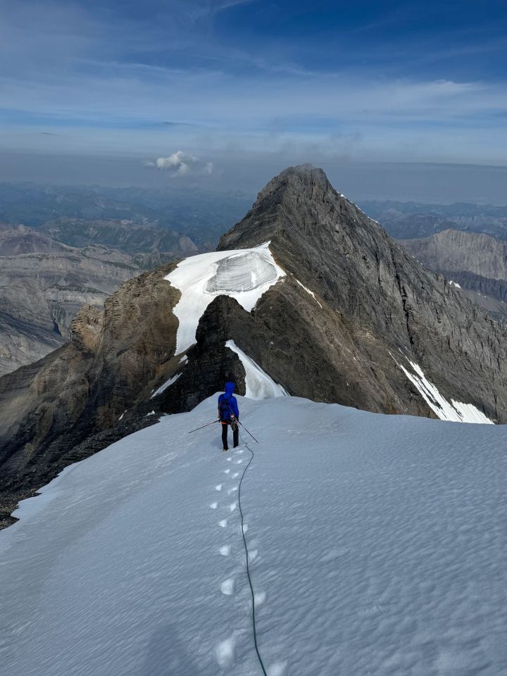Sehr gute Verhältnisse. Der Firn-Passagen gingen gut, haben in der letzten mal eine Schraube gesetzt, hätte es aber nicht gebraucht. Die Kletterei an dem Gendarmen macht Spass, ist aber wirklich ausgesetzt und brüchig. Ein Klebehaken in der Flanke und eine Stange oben drauf helfen dort.