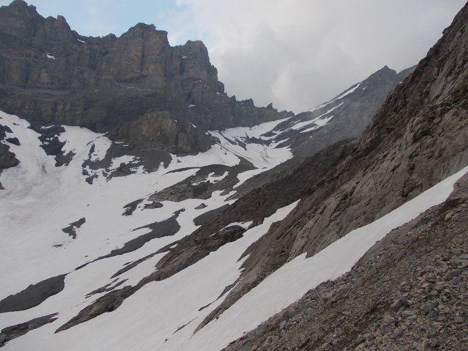 Trotz oder wegen üppiger Schneereste fanden wir gute Verhältnisse vor. Der steile Aufstieg frühmorgens in die Büttlassenlücke ließ sich im gut gefrorenen Firn per Steigeisen zügig bewältigen, wohingegen im Abstieg gegen 13.30 h dieser Hang bereits ziemlich aufgeweicht war. Wenn´s dort ausapert, hat man reichlich Schutt und bei hoher Frequentierung ist dann sicher auch mit Steinschlag zu rechnen.