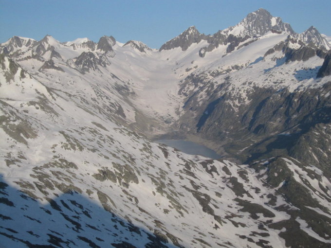 Vom Nordhang zwischen Oberaarrothorn und Roosehörner lagen zwei Schneebretter auf dem Gletscher.
