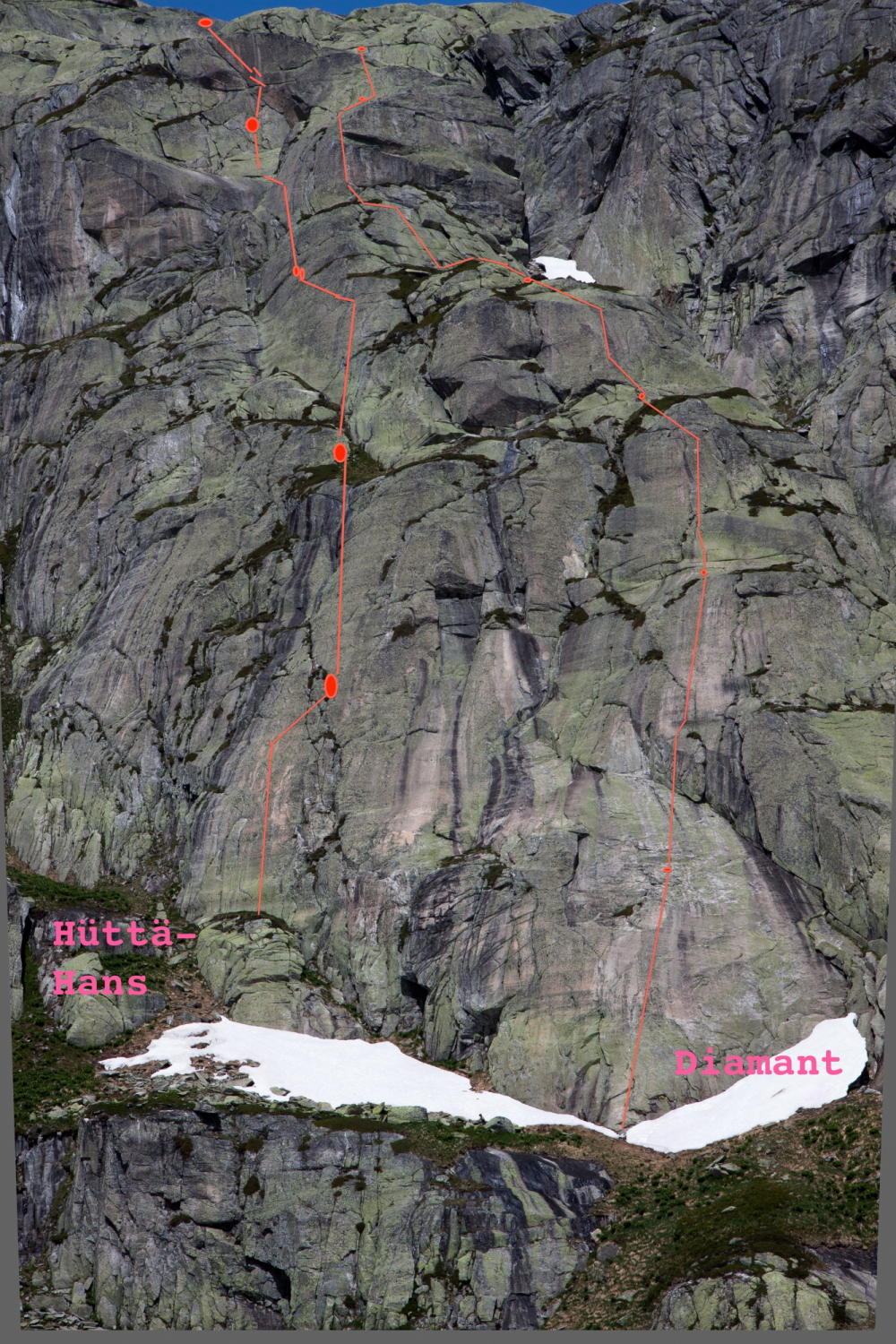Diamant schöne Plaisirroute. Gut abgesichert. 6 Seillängen im Schwierigkeitsgrad 6a. Zweitletzte Seillänge 6a mit 1 p.a. (kann auch frei geklettert werden 6b)