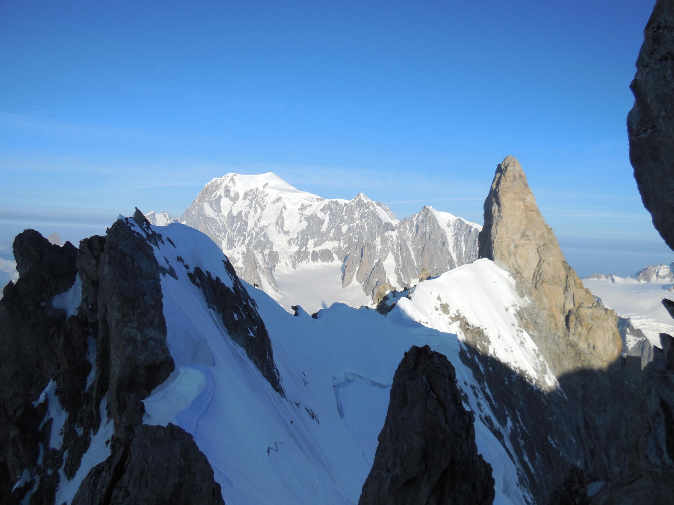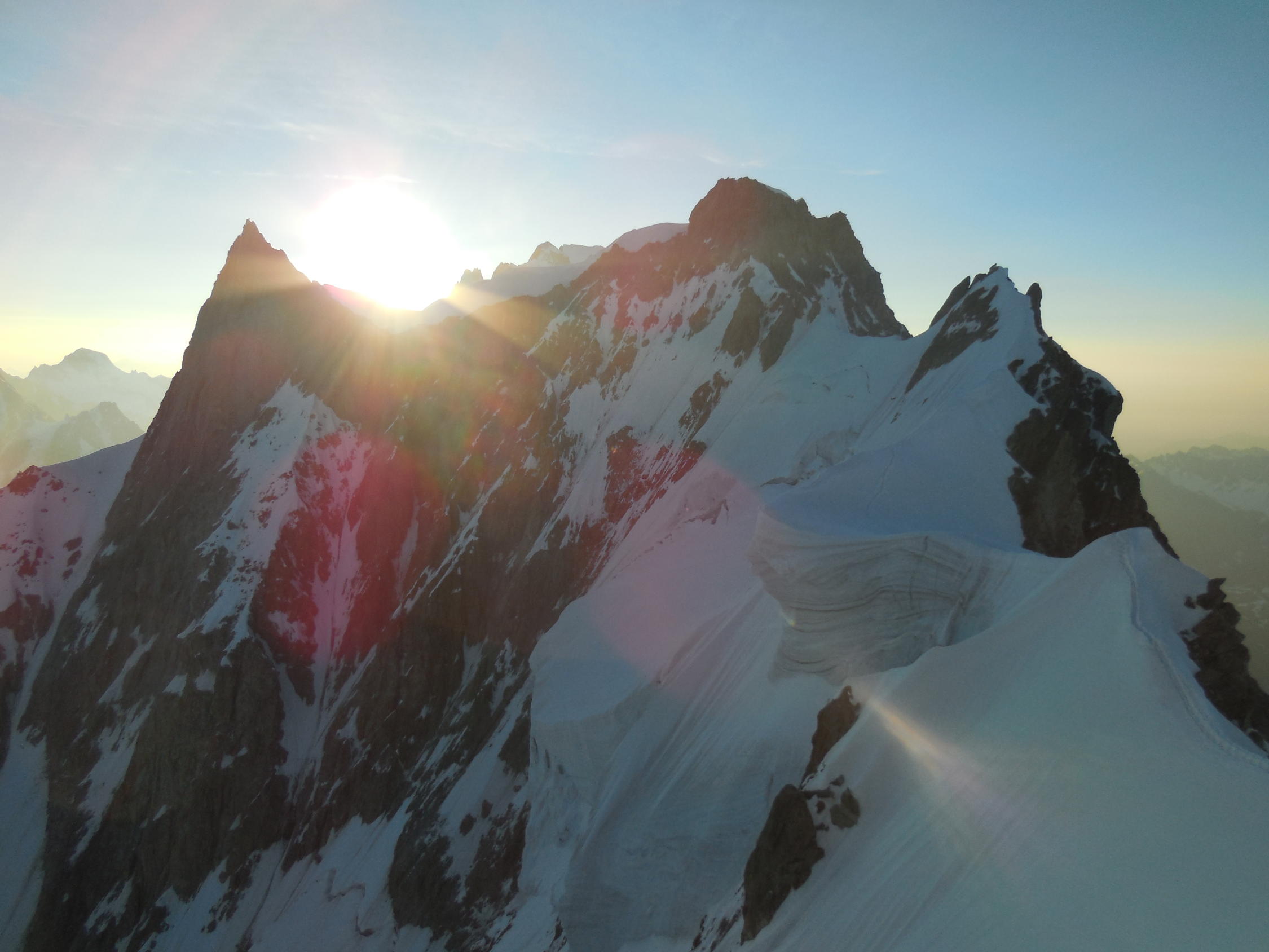 Sehr gute Verhältnisse am Rochefortgrat sowie im ganzen Gebiet. Die Spur am Grat ist aktuell ausgezeichnet. Vorsicht auf Steinschlag durch vorausgehende Seilschaften im Zustieg zum Frühstücksplatz sowie an der Gipfelpyramide. Wir sind den recht selten begangenen SW Grat zum Dome de Rochefort 4015m weitergegangen. Hierzu steigt man vom Gipfel der Aguille in einen Sattel ab und ersteigt eine steile, nicht zu unterschätzende Graterhebung im SW Grat ( Firnflanke ). Weiter über den Grat und die Gipfelfelsen ( 2 ) auf den höchsten Punkt. Cirka 2 Stunden von der Aguille de Rochefort.