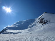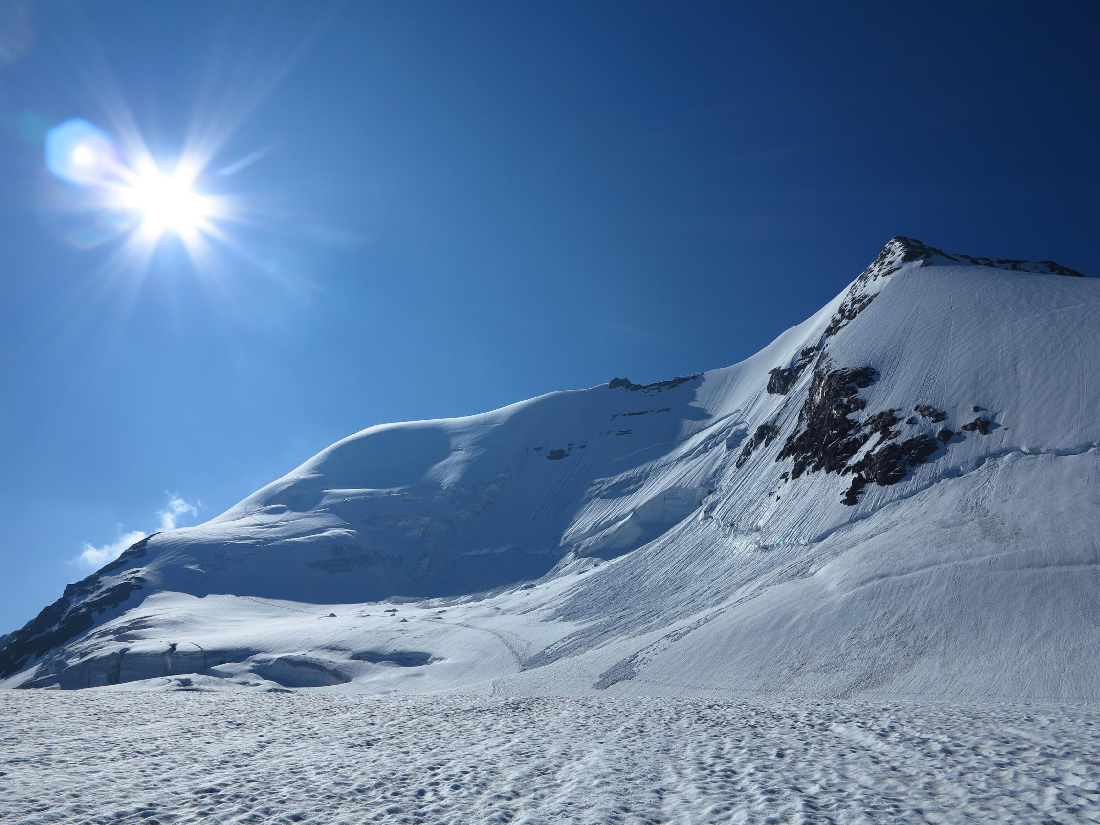 Gute Verhältnisse am Berg. Der Blüemlisalpgletscher ist perfekt eingeschneit. Die Schneedecke nicht beinhart, aber im grossen Ganzen gut gefroren. Die Eisnase kurz unter dem Gipfel wird am besten rechts umgangen. Die Blüemlisalp Überschreitung schaut verlockend aus, sprengt aber das Niveau der Tourenwoche Rund um die Blüemlisalp.
