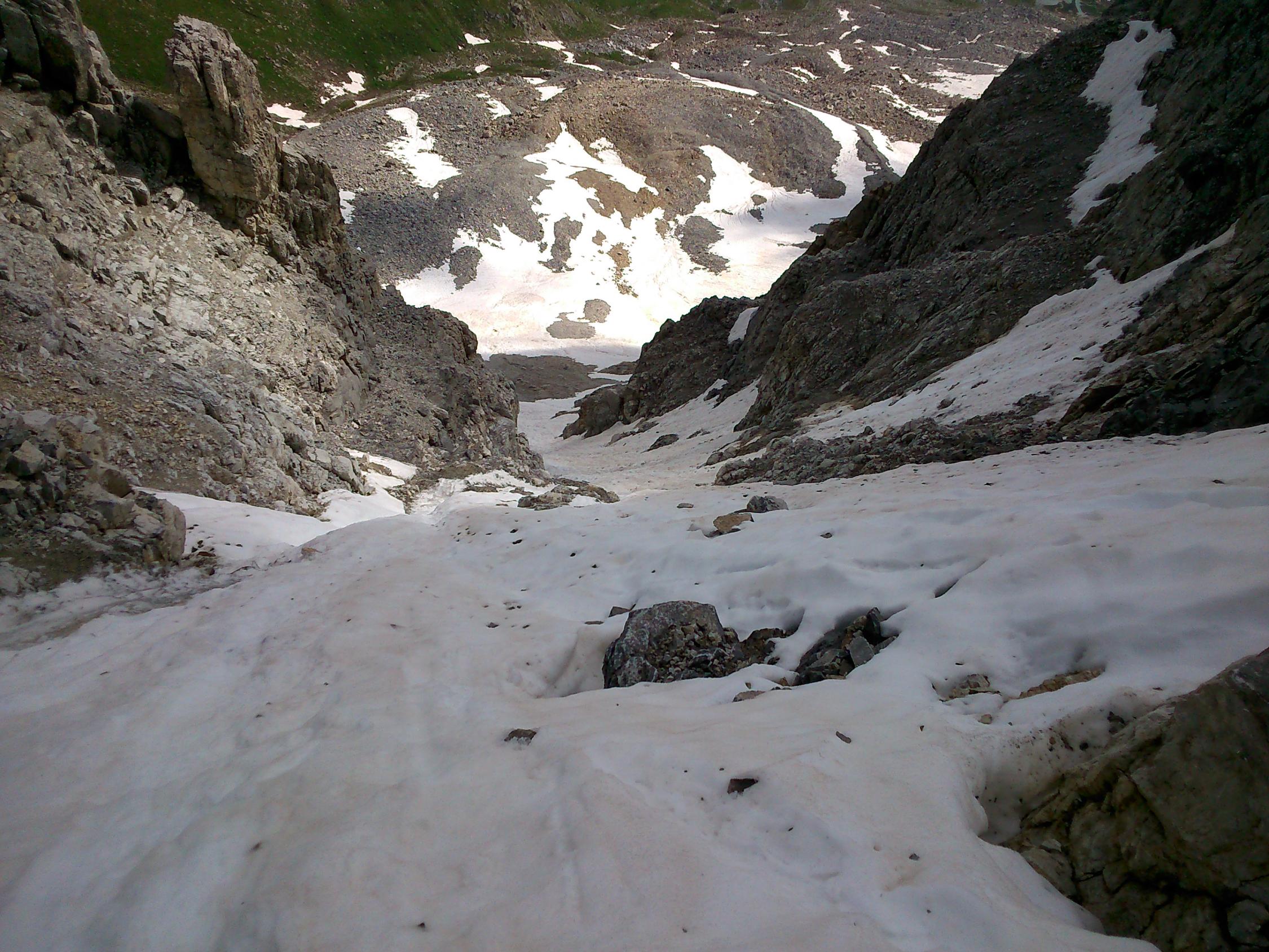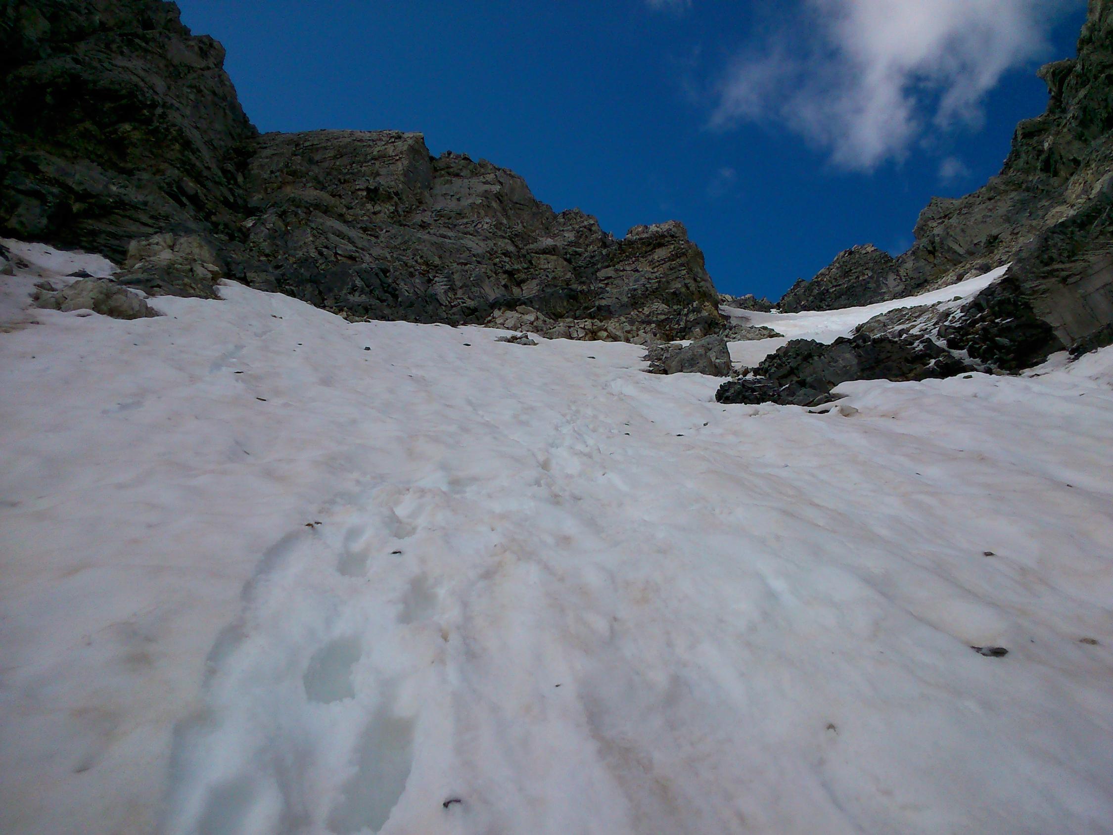 Die Schneerinne ist nicht mehr lange durchgehend. Dann muss im Fels abgeklettert werden.