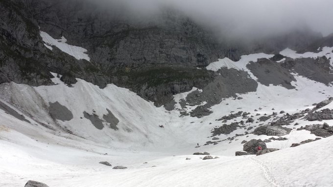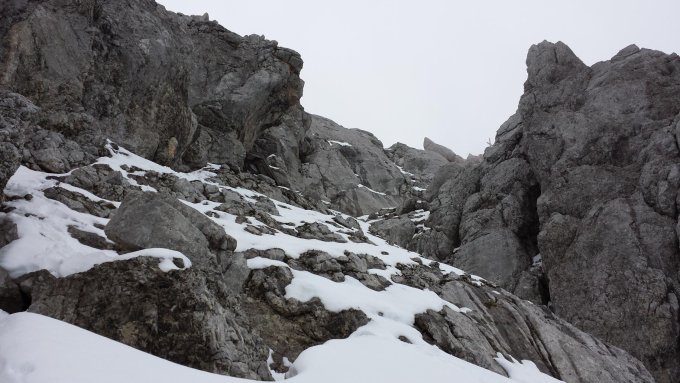 Zwischen Wochenbrunner Alm und Gruttenhütte unproblematische Wandertour. Ab Hochgrubach (ab ca. 1800m) schneebedeckt. Einstieg zum Gamsanger gut machbar, im Gamsanger und kurz vor der Jägerwand noch Altschneefelder, Ketten kurz nach Jägerwand noch unter dem Schnee. Kamin nicht passierbar, voller Schnee; bei der Weggabelung den rechten Weg wählen. Oberhalb des Kamins bis zum Gipfel komplett schneebedeckt.