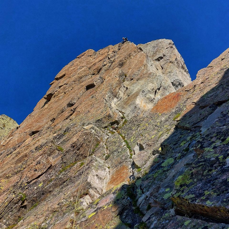 Nachtrag zum Eintrag vom September 2023. Der Turm nach dem Abbruch kann in einer Seillänge (50er Seil, braucht es fürs Abseilen vom Gipfel) erklettert und über Bolts gesichert werden, Zwischensicherungen möglich. Schwierigkeit im 5er Bereich, gutgriffig, oben fast senkrecht.