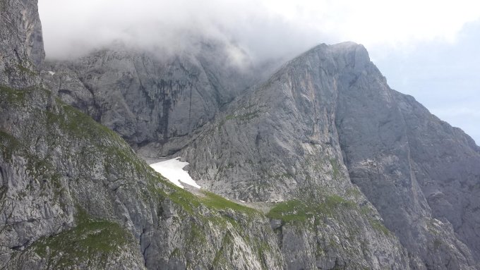 Zwei Altschneefelder vorhanden: eins unterhalb der Steilstufe, welche zum Niedersessel hochführt und eines im Niedersesselkar. Beide problemlos traversierbar (um sich sicherer zu fühlen auch mit Halb-Steigeisen).