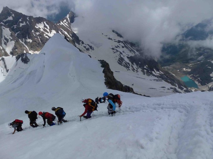 Einstieg Ostpfeiler gegen sieben Uhr, ca. 7-8 Seilschaften in der Route. Erste zwei Seillängen bis auf den Grat nass und unangenehm. Es hat aber Bohrhaken und zwei einwandfreie Standplätze. Am Grat selbst dann trocken und super zu gehen. Route einfach zu finden, immer auf dem Grat bleiben. Auf dem Grat keine Bohrhaken mehr, aber bei Bedarf sehr gut mit Schlingen, Friends und machmal auch Keilen absicherbar. Bis auf eine Seilschaft sind am Grat alle über weite Strecken am laufenden Seil gegangen. Wer alles von Stand zu Stand sichert, braucht für die Route sicher sehr lange (die erwähnte Seilschaft fiel weit zurück). Plattige Schlüsselstelle am Turm mit IV+ aus unserer Sicht durchaus hart bewertet. Es stecken aber einige geschlagene Haken und zusätzliche Absicherung ist möglich. Firnteil oben geht nicht besser. Kein Eis, ideale Spur.