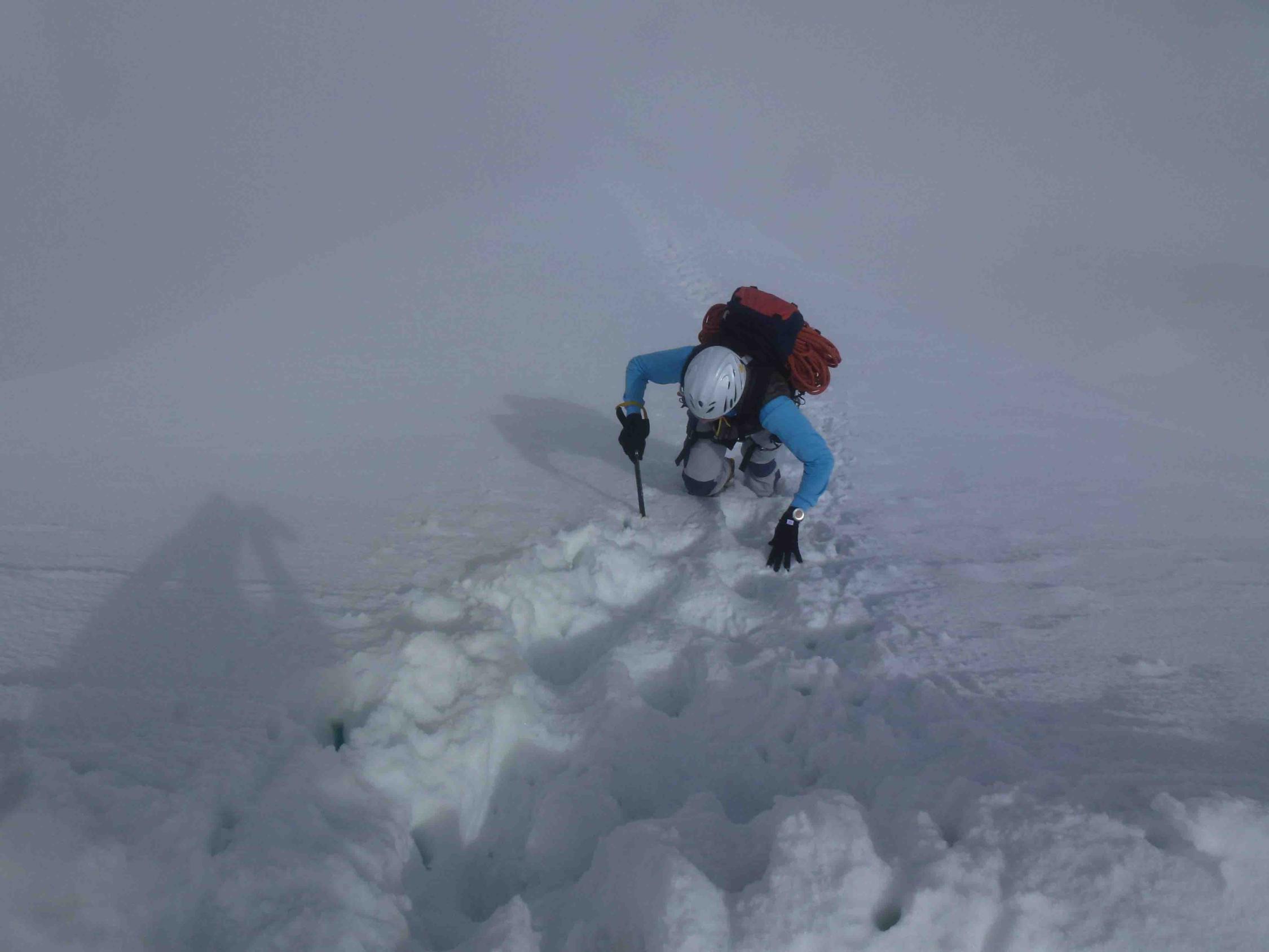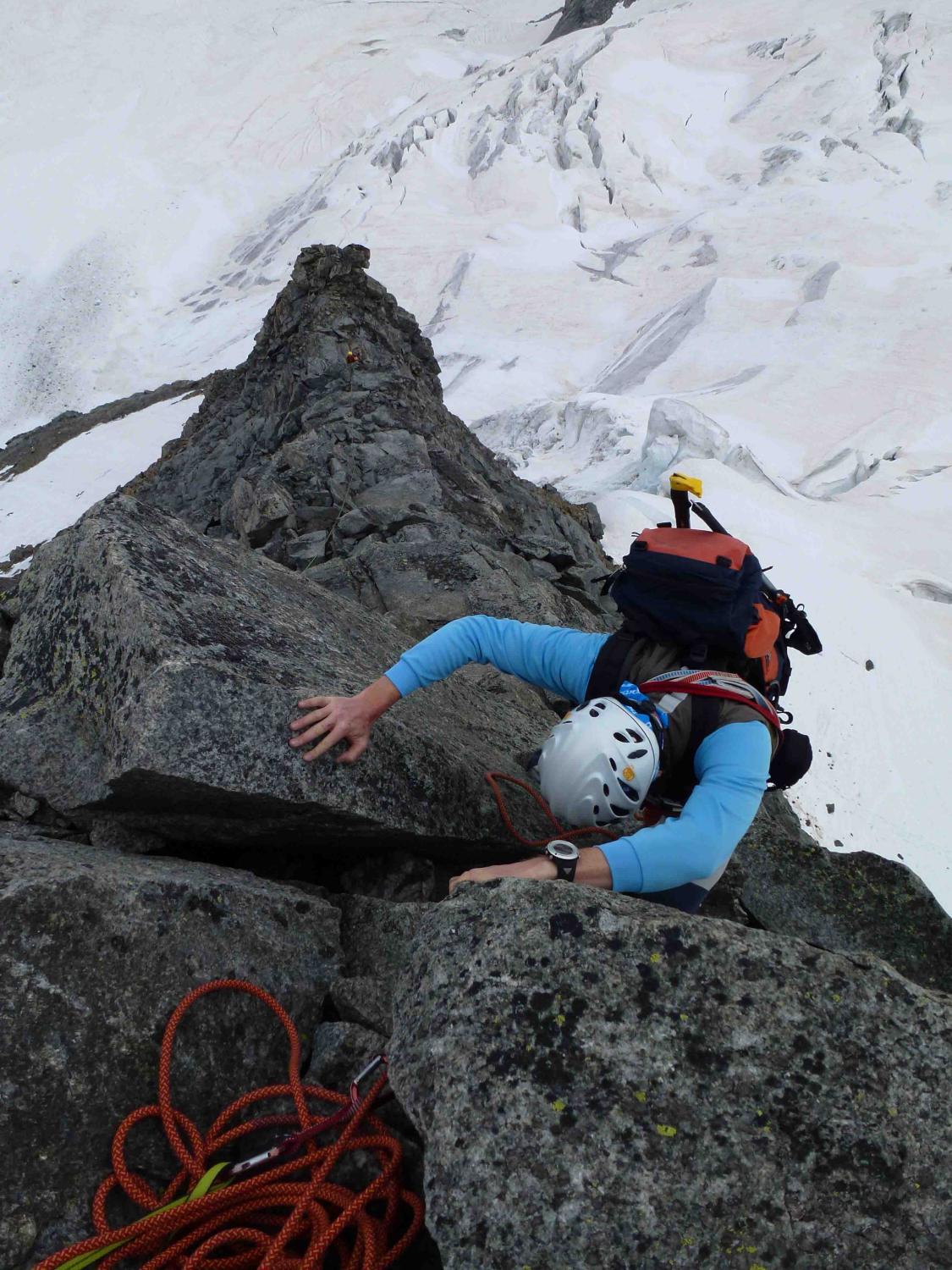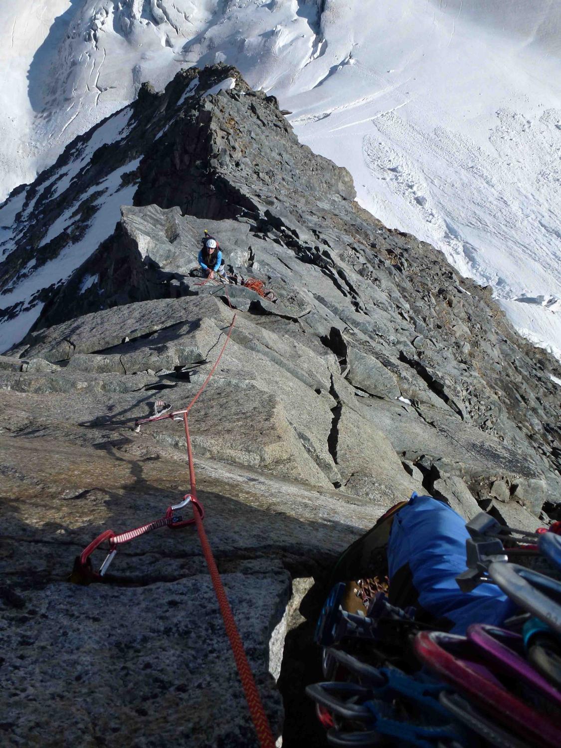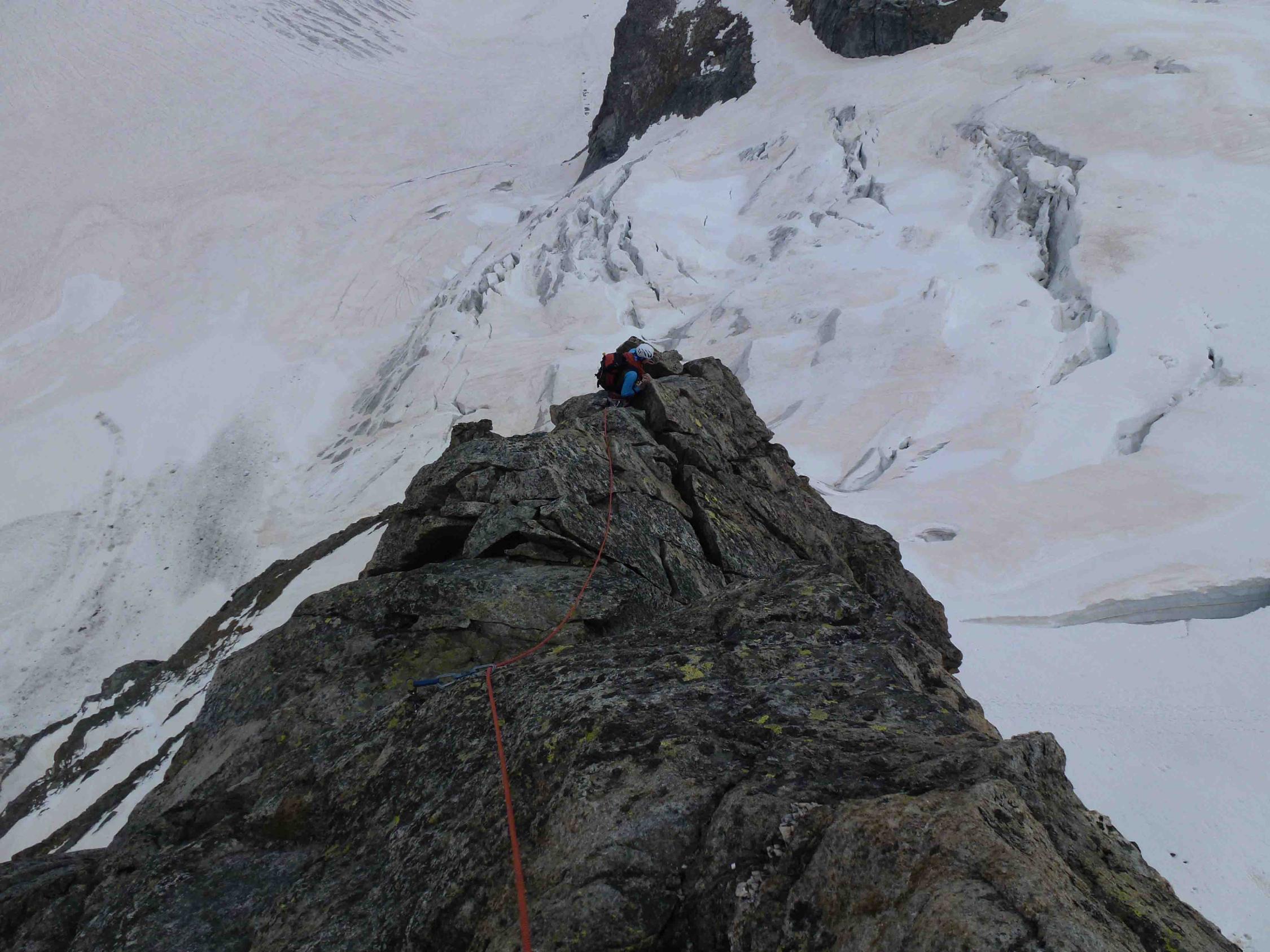 Einstieg Ostpfeiler gegen sieben Uhr, ca. 7-8 Seilschaften in der Route. Erste zwei Seillängen bis auf den Grat nass und unangenehm. Es hat aber Bohrhaken und zwei einwandfreie Standplätze. Am Grat selbst dann trocken und super zu gehen. Route einfach zu finden, immer auf dem Grat bleiben. Auf dem Grat keine Bohrhaken mehr, aber bei Bedarf sehr gut mit Schlingen, Friends und machmal auch Keilen absicherbar. Bis auf eine Seilschaft sind am Grat alle über weite Strecken am laufenden Seil gegangen. Wer alles von Stand zu Stand sichert, braucht für die Route sicher sehr lange (die erwähnte Seilschaft fiel weit zurück). Plattige Schlüsselstelle am Turm mit IV+ aus unserer Sicht durchaus hart bewertet. Es stecken aber einige geschlagene Haken und zusätzliche Absicherung ist möglich. Firnteil oben geht nicht besser. Kein Eis, ideale Spur.