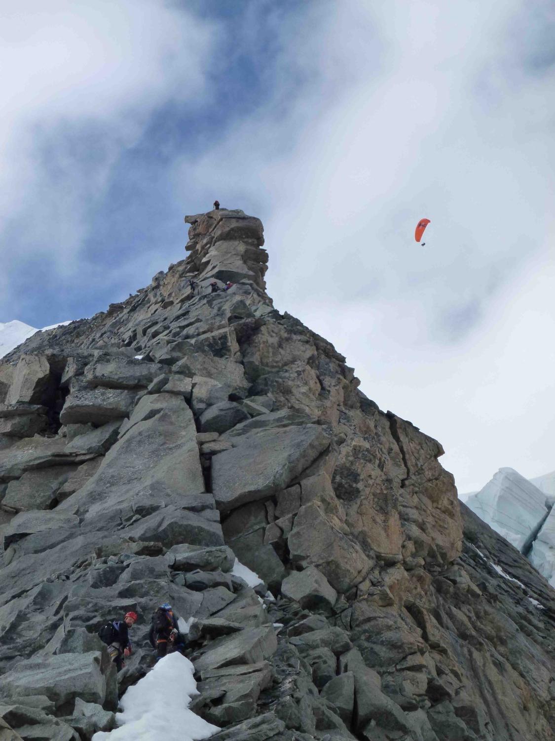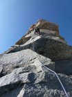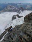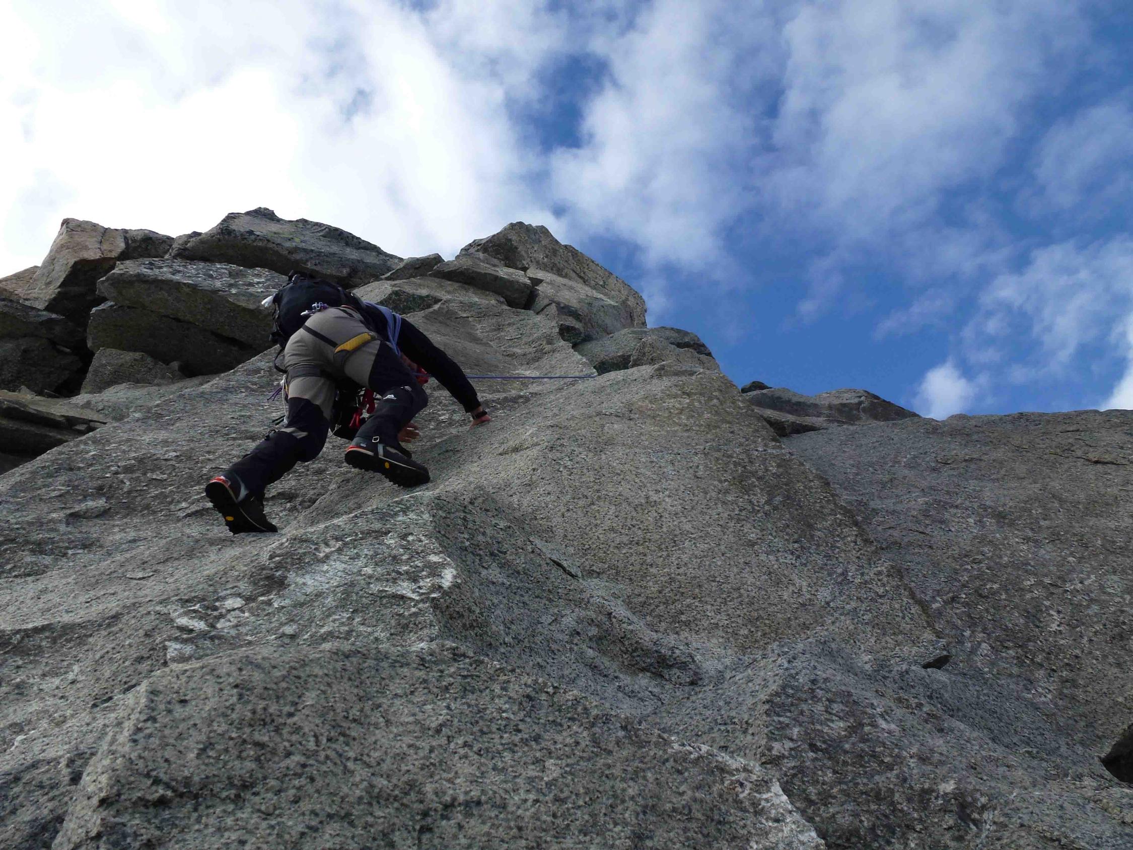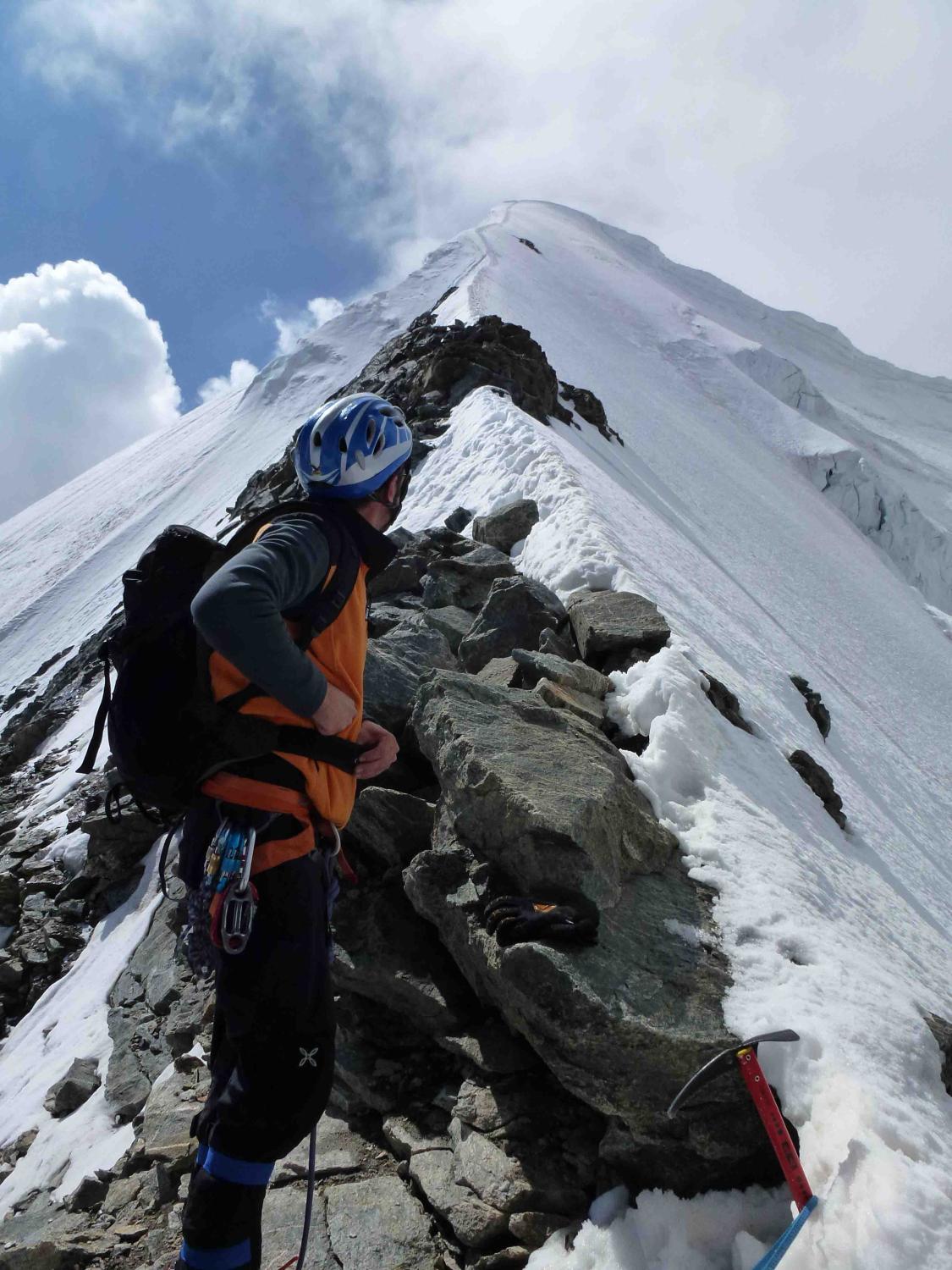 Einstieg Ostpfeiler gegen sieben Uhr, ca. 7-8 Seilschaften in der Route. Erste zwei Seillängen bis auf den Grat nass und unangenehm. Es hat aber Bohrhaken und zwei einwandfreie Standplätze. Am Grat selbst dann trocken und super zu gehen. Route einfach zu finden, immer auf dem Grat bleiben. Auf dem Grat keine Bohrhaken mehr, aber bei Bedarf sehr gut mit Schlingen, Friends und machmal auch Keilen absicherbar. Bis auf eine Seilschaft sind am Grat alle über weite Strecken am laufenden Seil gegangen. Wer alles von Stand zu Stand sichert, braucht für die Route sicher sehr lange (die erwähnte Seilschaft fiel weit zurück). Plattige Schlüsselstelle am Turm mit IV+ aus unserer Sicht durchaus hart bewertet. Es stecken aber einige geschlagene Haken und zusätzliche Absicherung ist möglich. Firnteil oben geht nicht besser. Kein Eis, ideale Spur.