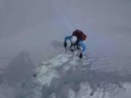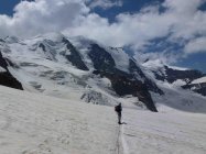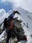 Letzte Querung zum Einstieg ist eisschlaggefährdet. Als wir am Grat waren, ging eine Eislawine über die Aufstiegsspur.