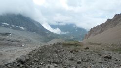 Einige Schneefelder im Aufstieg zum Chaltwasserpass, der Pickel war hilfreich. Die Spur ist an mehreren Stellen durch Lavinen und Murgänge durchgespült. Der Steilhang mit dem Wasserfall (vor den Ketten) ist sehr brüchig und verlangt etwas Spürsinn für die Wegfindung.