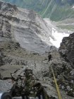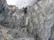 Der Ostgrat wird mit Vorteil im Abstieg (Aufstieg Bänderweg oder Eisnase und Abstieg z.B. wie im vorliegenden Fall Ostgrat) begangen, zumal im Abstieg den grössten Teil der Türme überklettert werden kann, dass heisst, diese an ihren Schlüsselstellen nicht mühsam und ohne gross Sicherungsmöglichkeiten abgeklettert werden müssen. Nur gerade das Ende (im Abstiegssinn) der Route (Punkt 3064) ist saniert (einige BH); es kann am Ende (Abstiegssinn) auf den Bänderweg (Punkt 3064) abgeseilt (Klebehaken)werden. Der Rest der Route ist mit lediglich einem Schlaghaken ca. in Gratverlaufmitte ausgerüstet. Teils luftige Kletterei in schiefrig/brüchigem Fels. In Gratverlaufmitte nicht tief in die Nordflanke ausweichen, sondern eher auf dem Grat bleiben, oder diesen bald wieder aufsuchen, ansonsten man sich in gefährlich brüchiges Gelände manövriert. Die Route erfordert sehr gute Trittsicherheit, Routenverlaufgespühr und Kletterkönnen in eher schlechtem Fels, Ausgesetztheit und schlechter Absicherbarkeit. Schade dass der Ostgrat nur am Ende (Abstiegssinn)/Anfang (Aufstiegssinn) mit gerade nur einer Seillänge saniert (BH) ist. Vielleicht wird das Projekt in Zukunft irgendwann vollendet. Bietet der Grat doch luftig, imposante Kletterei in einer tollen Umgebung. Ca. Zeitbedarf für den Grat alleine 3-5 h (gemäss Führerliteratur 5h)