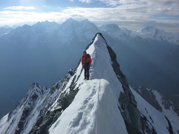 Nach dem Frühstückplatz gibt es am "Felsgrat" einige Schneepassagen. So geht man mehrfach über die ausgesetzte, beeindruckende Firnschneide.