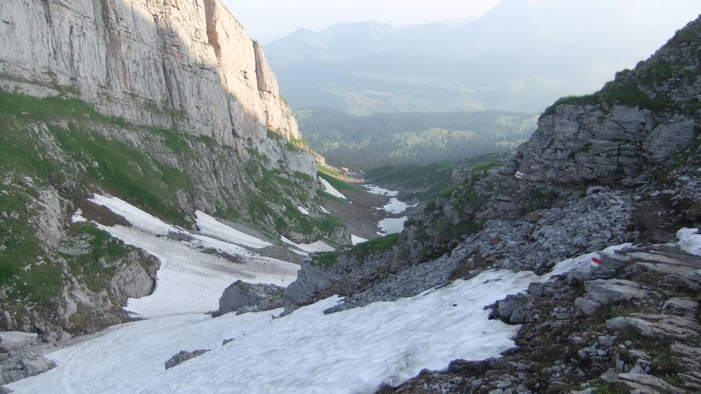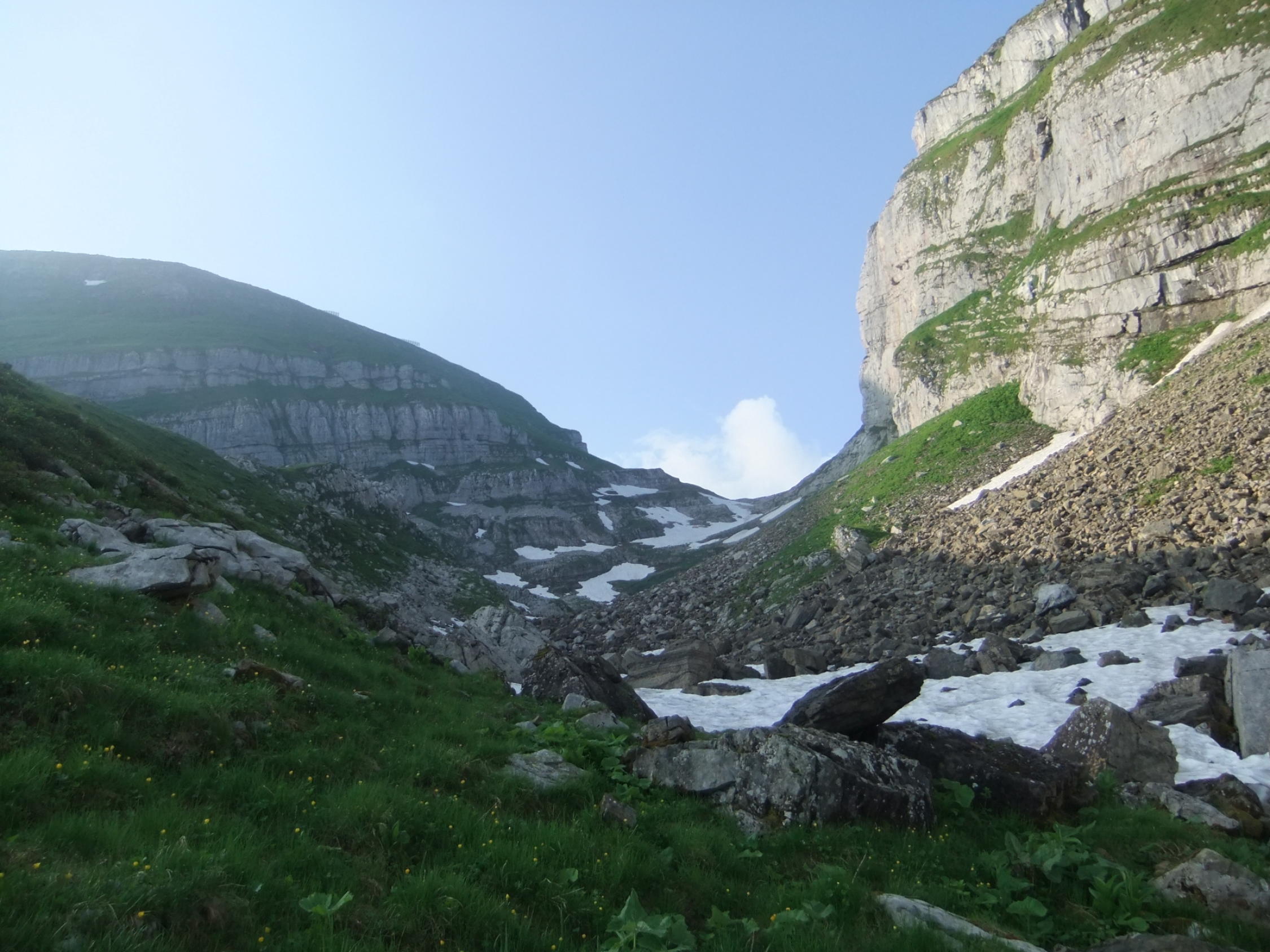 Der Abstieg vom Hinterrugg zum Glurisattel war schneefrei, im Glurital jedoch von oben bis fast zum Geröllfeld welches dann nach Westen gequert wird, Schneefeld, gut zum Abfahren geeignet. Damit vermied ich den Abstiegsweg rechts vom Schneefeld entlang der Westflanke des Hinterrugg, die ich vom letzten mal nicht so gut in Erinnerung hatte (24.5.2010, mein erster Gipfelbucheintrag in diesem Forum).