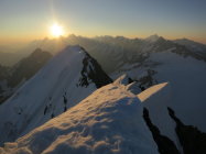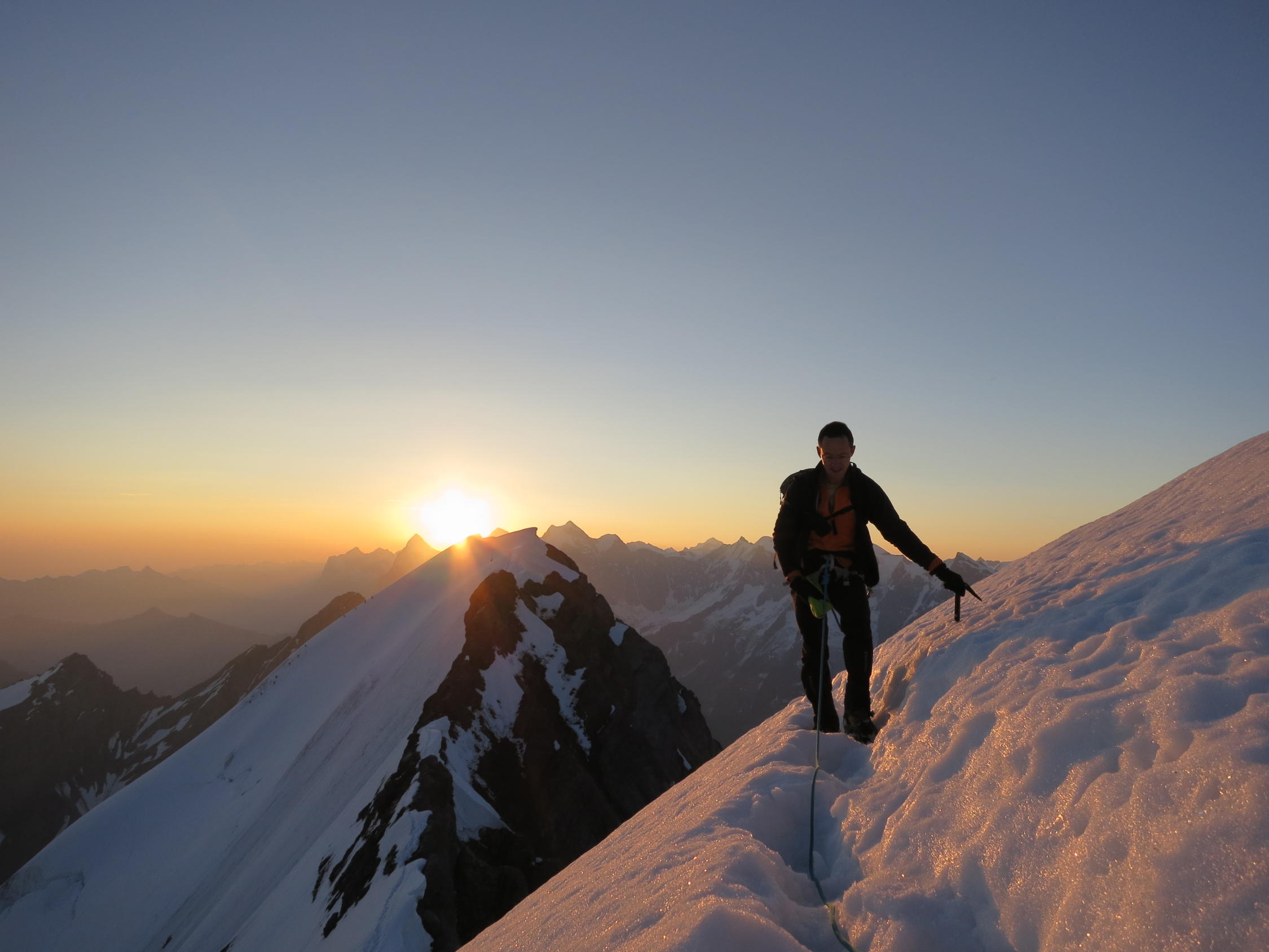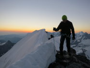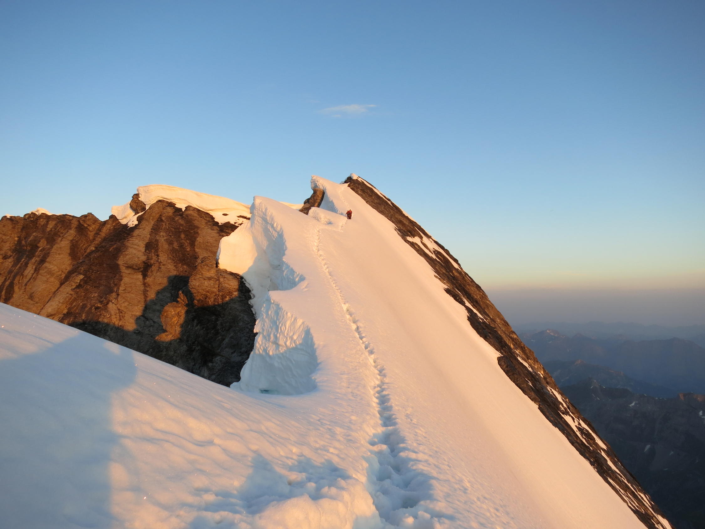 Aufstieg aufs Morgenhorn 2 Seillängen im Eis gesichert. Die Überschreitung ist gut gespurt und die Felsen sind trocken. Abstieg vom Rothornsattel bei besten Schneeverhältnissen. Der Schrund ist noch gut überdeckt.