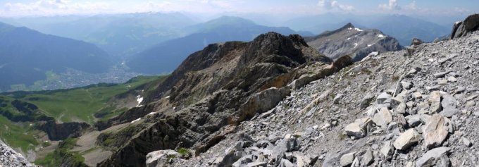 Im Sattel Tüfels Chilchli (2420 müM) dem Grat nach Norden ungefähr 250 Meter folgen und dann Richtung Osten zum Grat Calanda (Pkt. 2430 müM) queren.