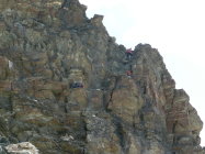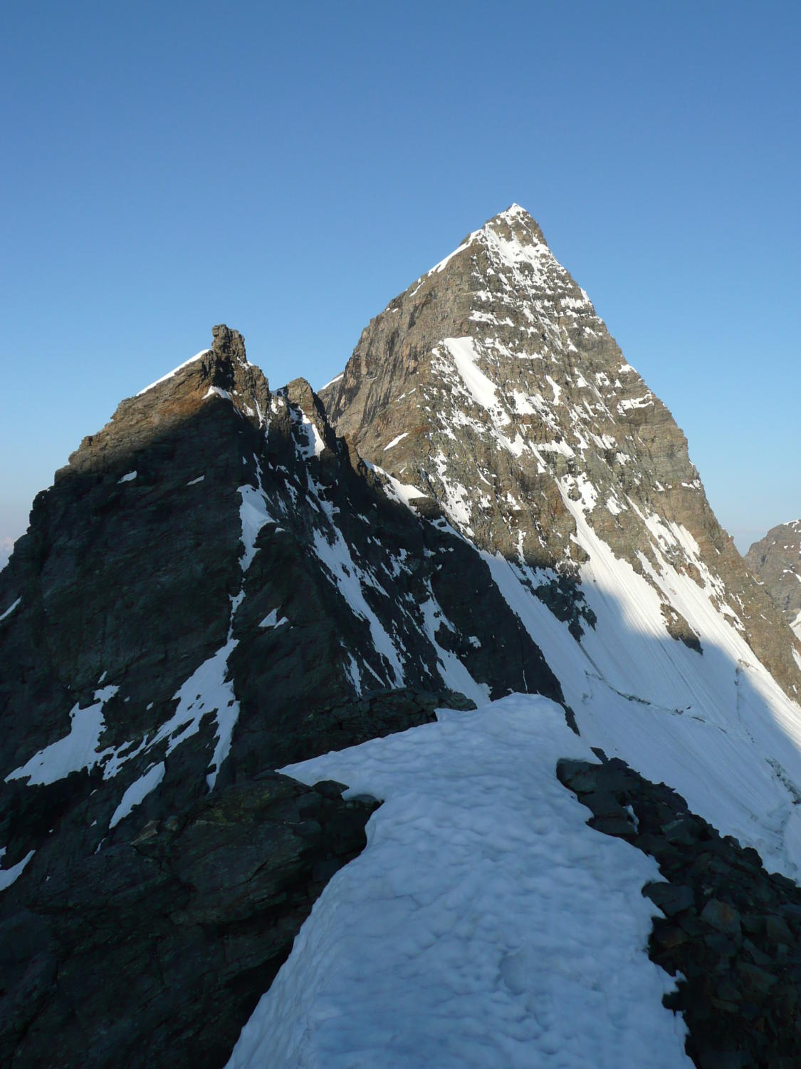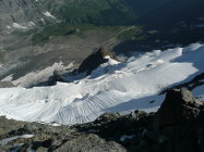 Gletscher gut eingeschneit. Trotz grosser Wärme kein Steinschlag beim Aufstieg aufs Schmadrijoch. Knifflige Passage in der Spaltenzone auf 2500m. Wir benutzen auf 2800m nicht das Couloir sondern die zt. brüchigen Felsen und den "brösmeligen" Schuttrücken. Querung nach NE auf ca 3000 wo noch etwas Schnee liegt. Nach 4.5h auf dem Schmadrijoch. Der Grat ist mit den wechselnden Schneepassagen sehr abwechslungreich.