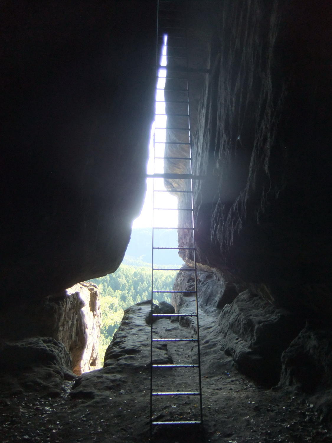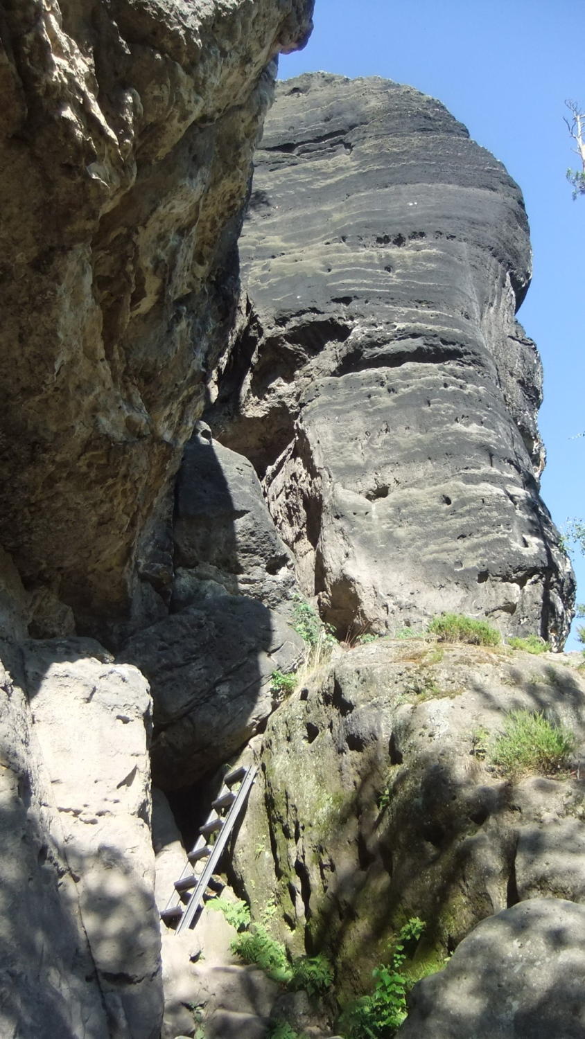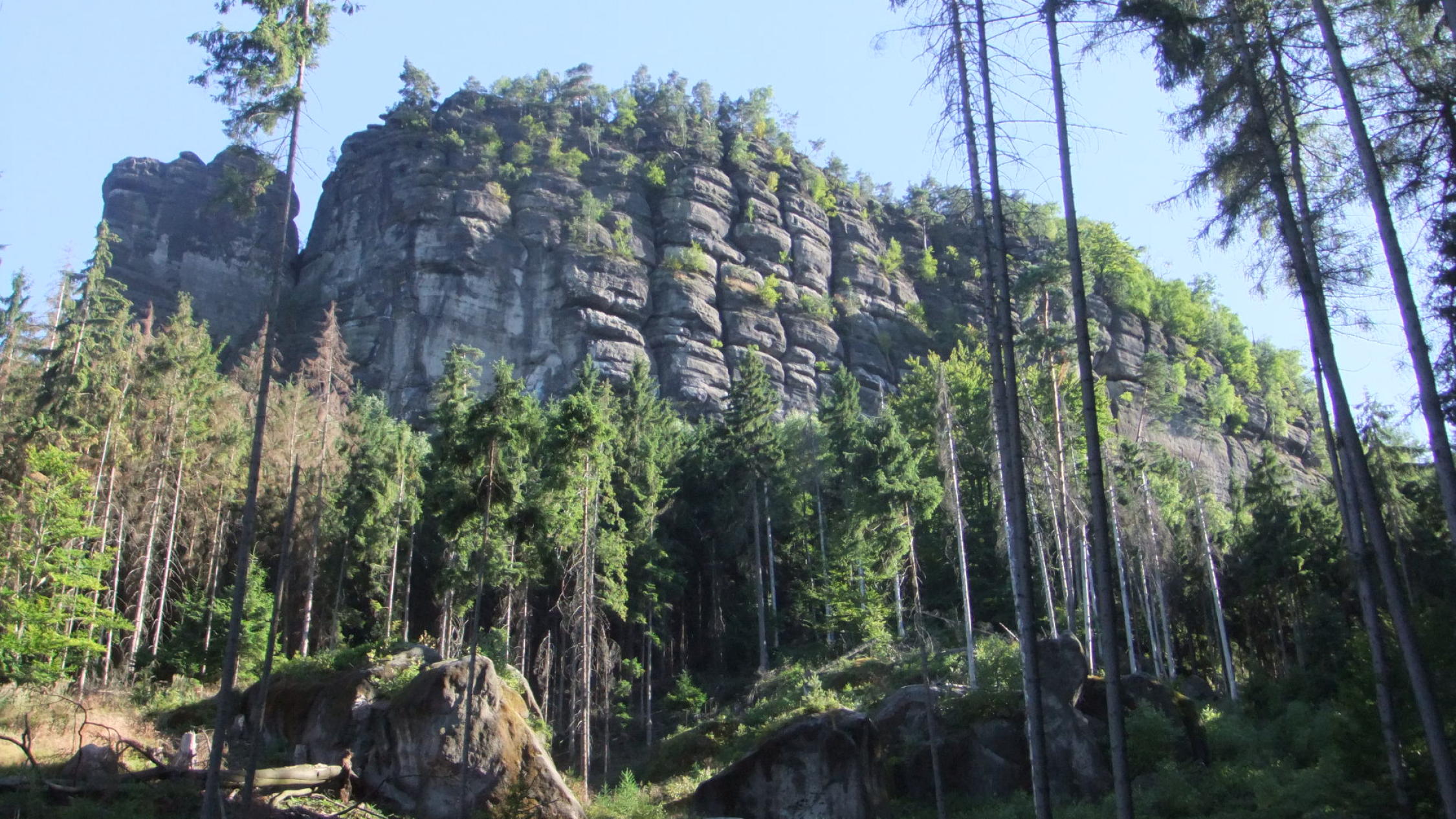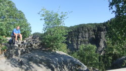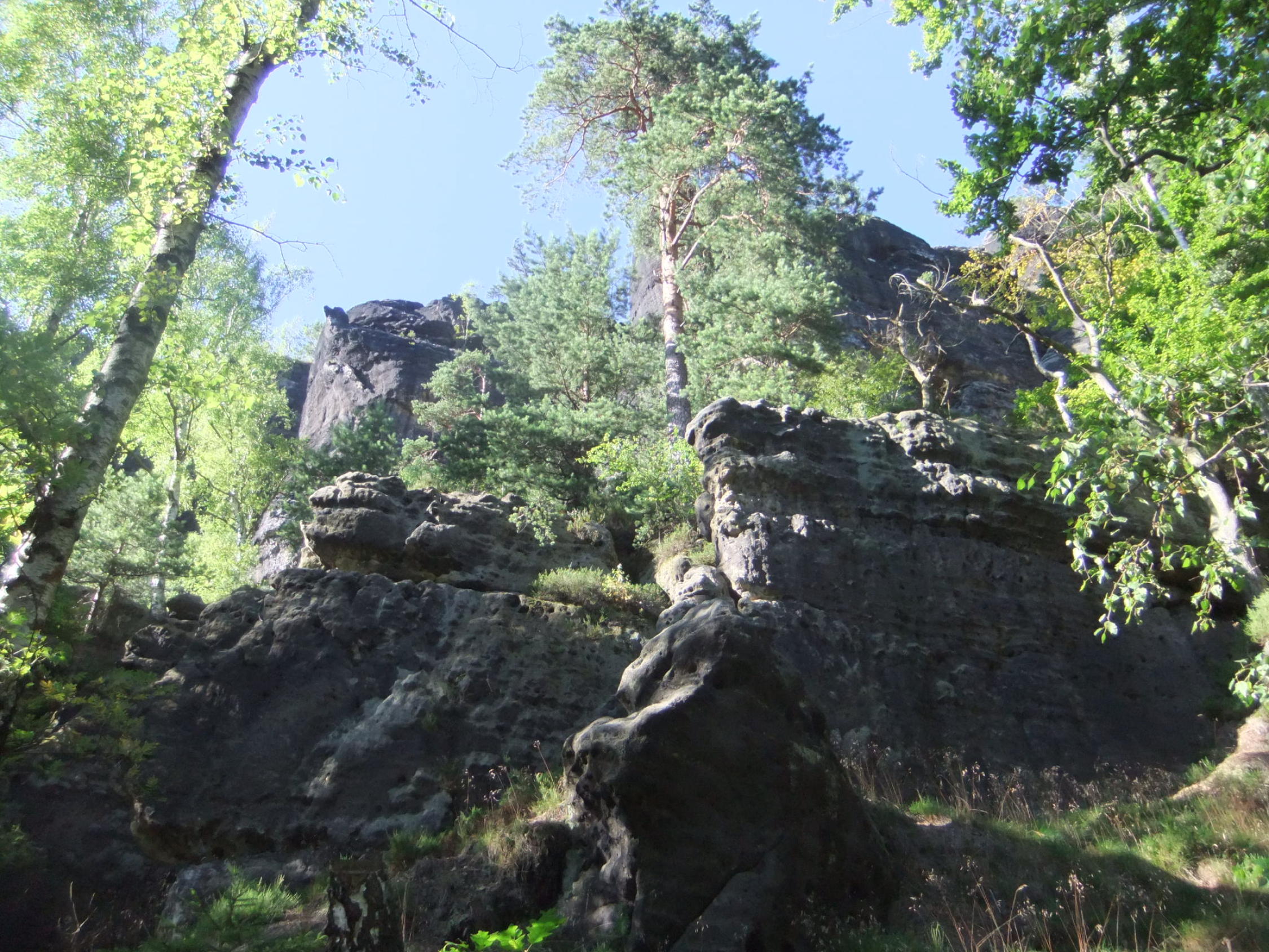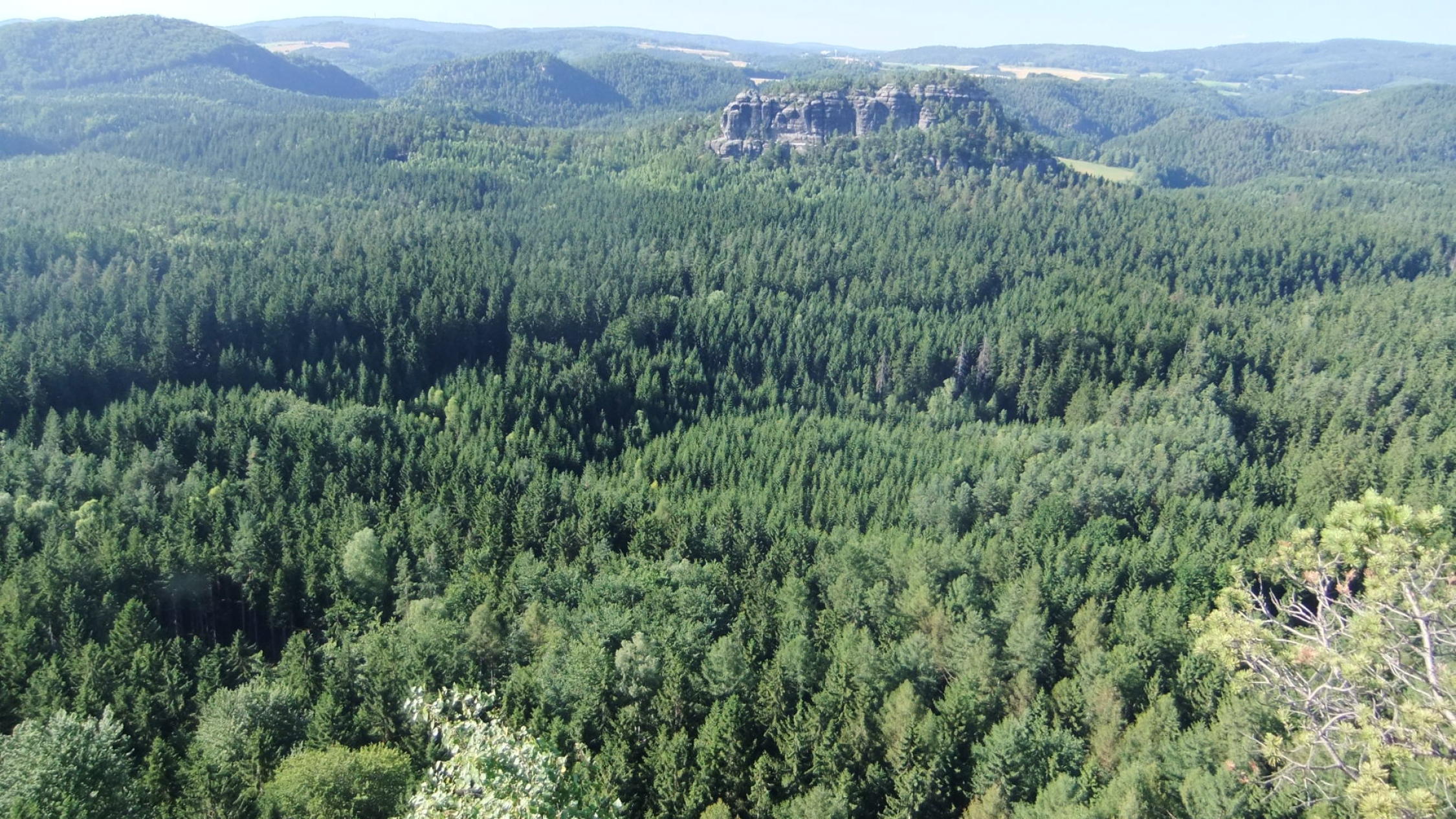 Aussicht auf die nahe liegenden Lorenzsteine im Norden, den großen Zschand im Nordosten, die Hexenspitze und den Bärenfangkegel im Osten, Rübezahlturm und Pilzturm im Südwesten.