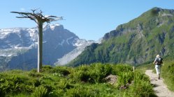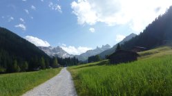 Am Sonntag gingen wir nochmals in den Klettergarten, wo uns ein paar schön fordernde Längen gelangen. Wir müssen ja für die Gamsfreiheit trainieren ... Am Nachmittag wanderten wir dann schwer bepackt zum Gauertal hinaus nach Latschau. Eine ausgiebige Rast bei der Gauertalhütte ließen wir uns nicht entgehen.