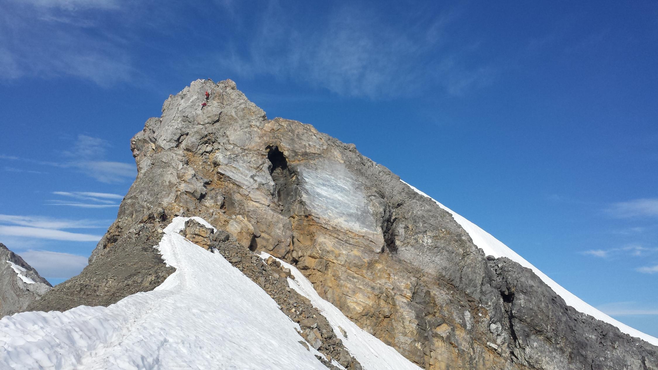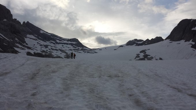 Aufgrund der grossen Wärme gefriert der Schnee auf dem Gletscher auch nachts nicht mehr und ist so auch bereits am frühen Morgen "zuckrig" - die Aufstiegsspur am nördlichen Rand des Gletschers ist jedoch noch komplett schneebedeckt. Dank des kühlen Südwestwindes war der Schnee beim Abstieg noch nicht ganz sulzig.