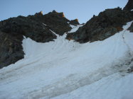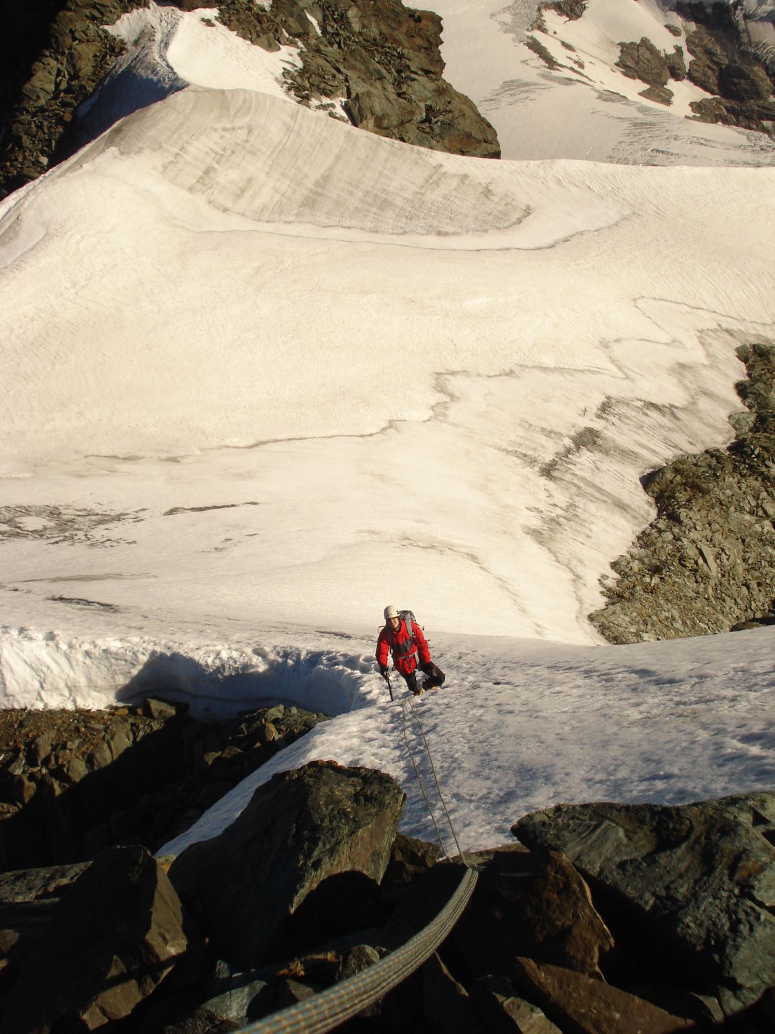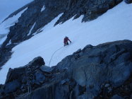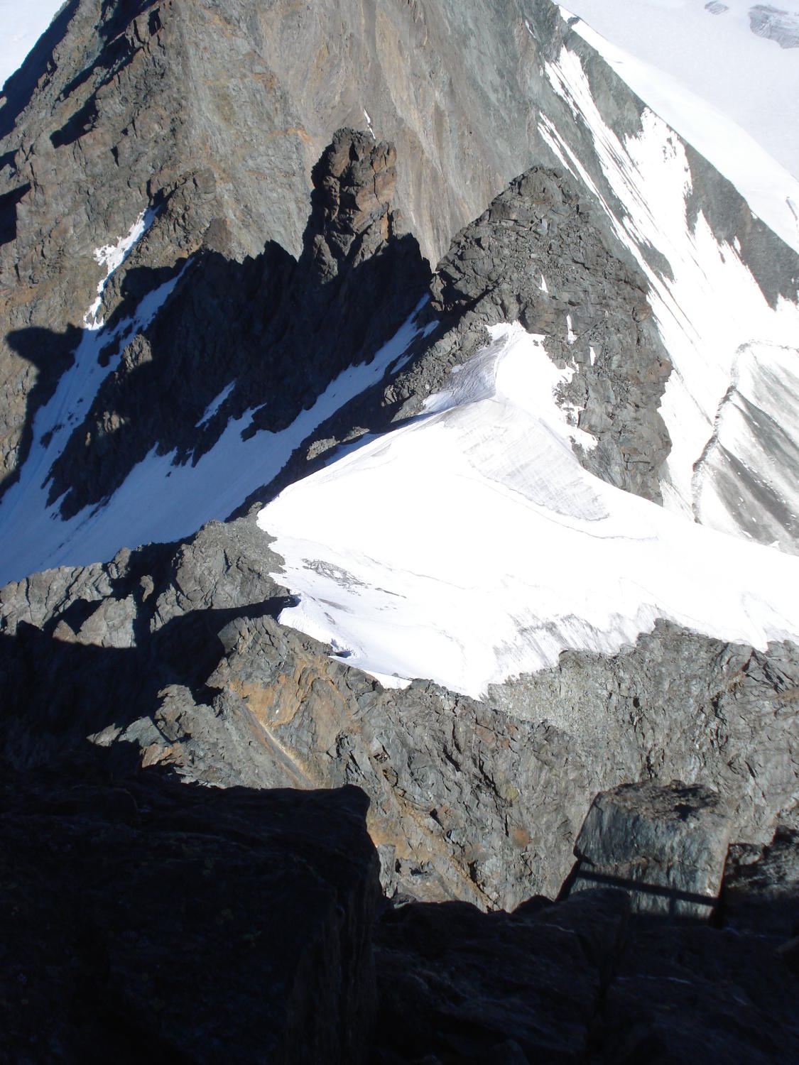 In der Grögerrinne perfekter Trittfirn. Am Grat selbst kein einziger Fleck Schnee. Das Teischnitzkees ist komplett zugeschneit, was die Spaltengefahr auf ein Minimum reduziert. Beim Abstieg wird der Schnee aufgrund der starken Sonneneinstrahlung sehr weich und unangenehm zu gehen. Am Grat selbst fegte ein schneidender Wind, der die Kommunikation etwas erschwerte und das Klettern ohne Handschuhe recht unangenehm machte. Dennoch ist der Fels extrem fest und bietet optimalen Halt.