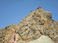 Für den Grat sind einige Schlingen und eventuell größere Klemmkeile ratsam, damit man Zwischensicherungen legen kann. Es sind Bohrhaken im Abstand von ca. 30m vorhanden, die gute Stand- und Sicherungsmöglichkeiten darstellen.