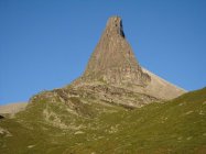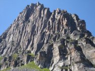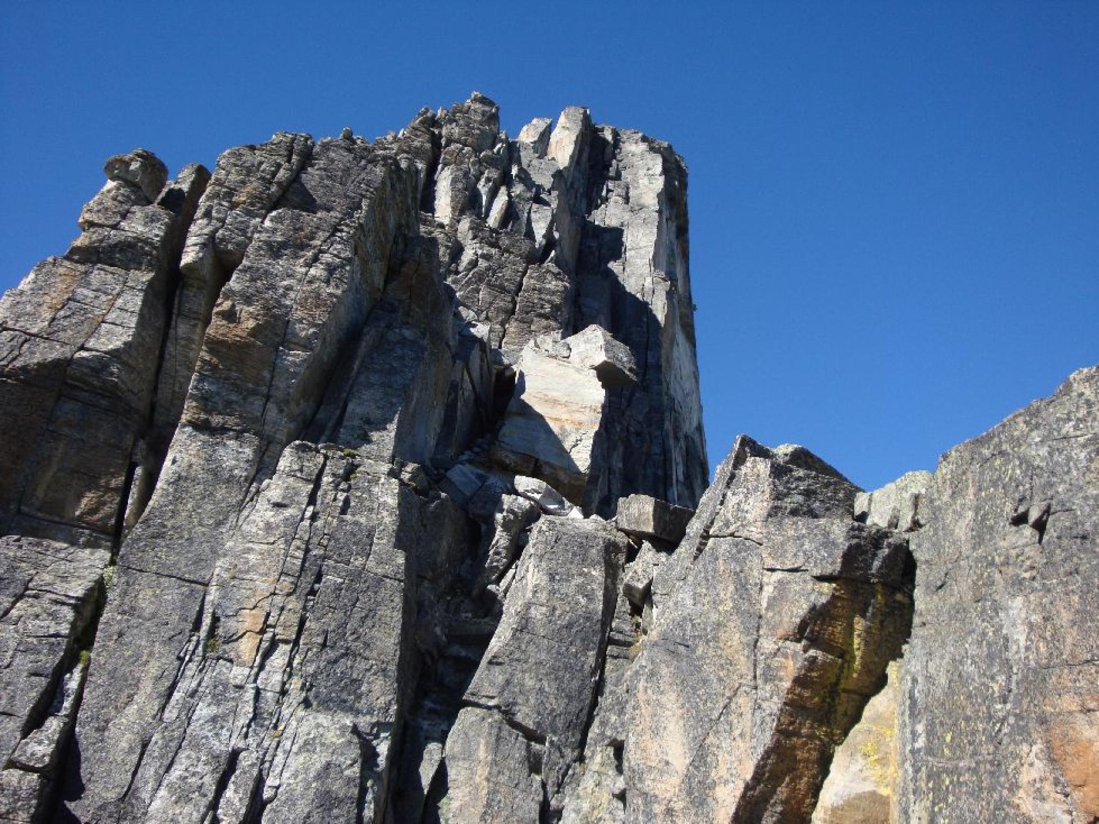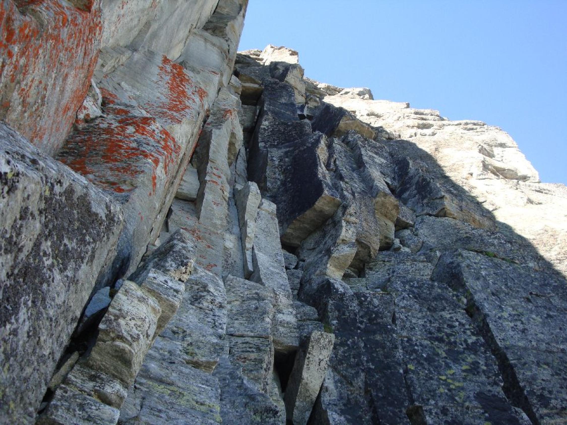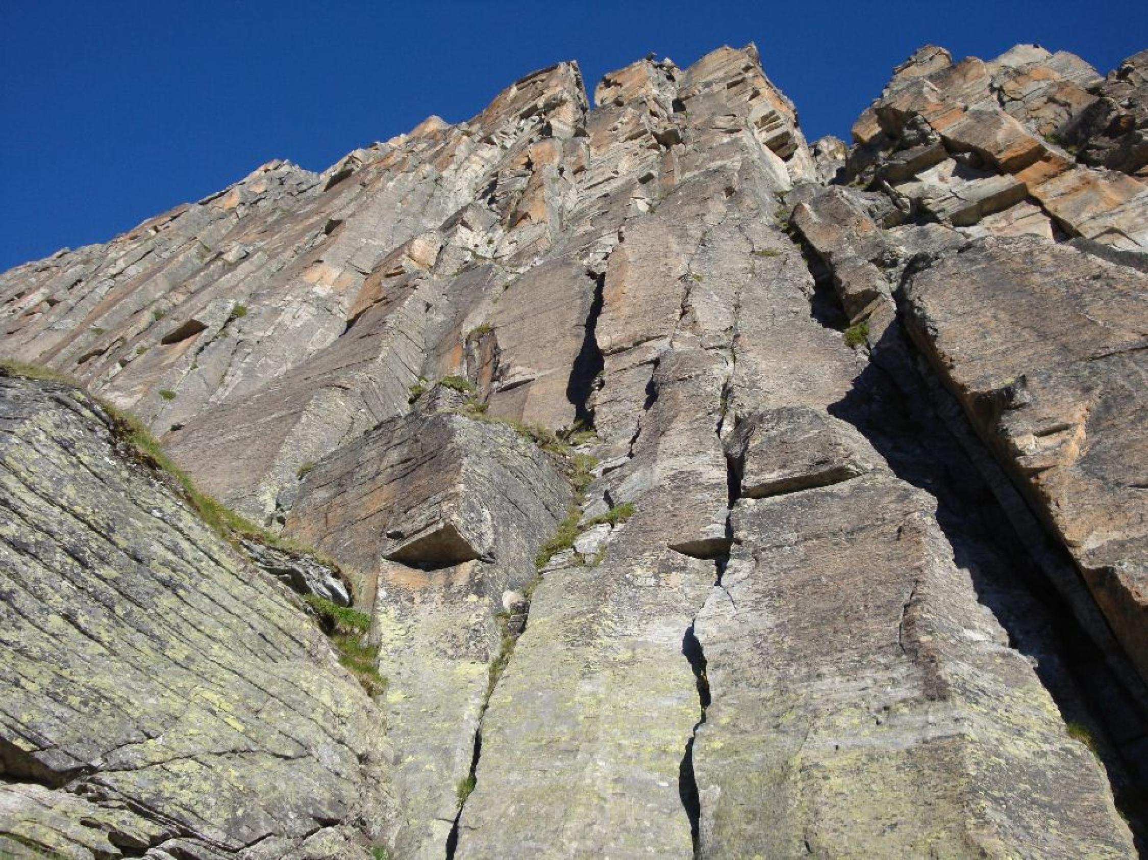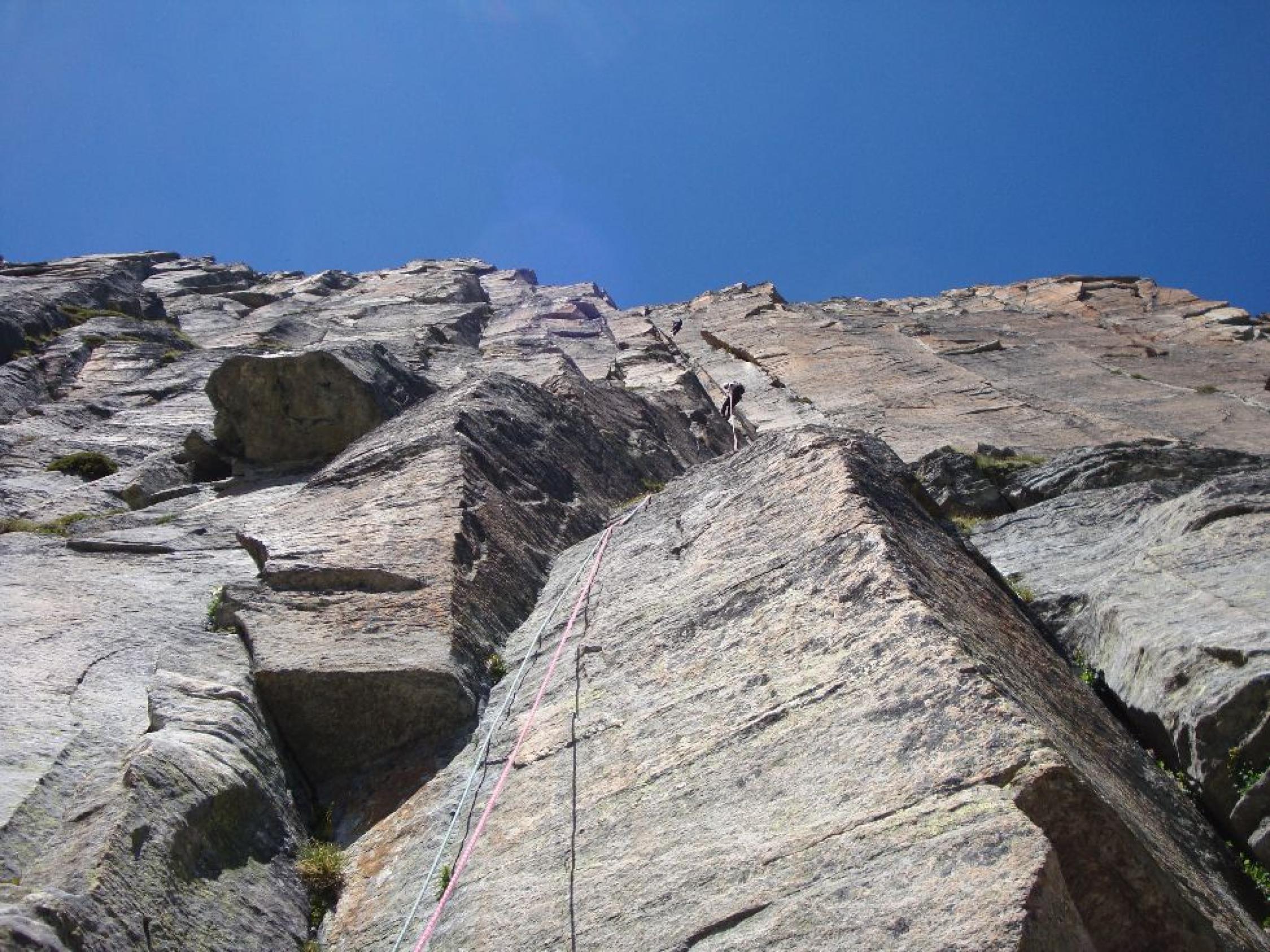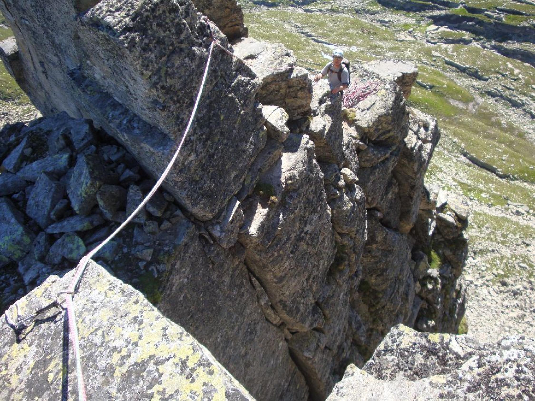 Nun über die Route in recht schöner und anregender Kletterei, in etwa 10 Seillängen auf den Gipfel. Die Route ist erstaunlich gut eingerichtet, brauchte nur einmal einen mittleren Friend. Trotzdem ist etwas Gespür für die Route nötig, da vorallem die Stände vielfach nicht gleich sichtbar angebracht sind. Auch die Bewertung im Plaisir Ost ist etwas mit Vorsicht zu geniessen, das mit dem 4b(obl.) ist schon etwas optimistisch. 3 Seillängen sind teilweise recht steil und anstrengend. Aber wenn man sonst ein 5c klettert ist man gut bedient. Auch das Abseilen ist nicht ohne, sehr steil, dafür geht es zügig runter. Wir hatten 2x50m Seile und kammen so gut mit 5x Abseilen hinunter. Man könnte aber auch noch eine Überschreitung zum Südgipfel hinüber anhängen. Zieht sich, aber vielleicht dann beim nächsten Mal. Auf jeden Fall eine lohnende Tour auf einen markanten Bündner Gipfel, welcher auch weitere schöne Routen in gutem Fels hat. Trotzdem hat es noch ein paar brüchige Passagen auf denen man auf Steinschlag achten sollte.