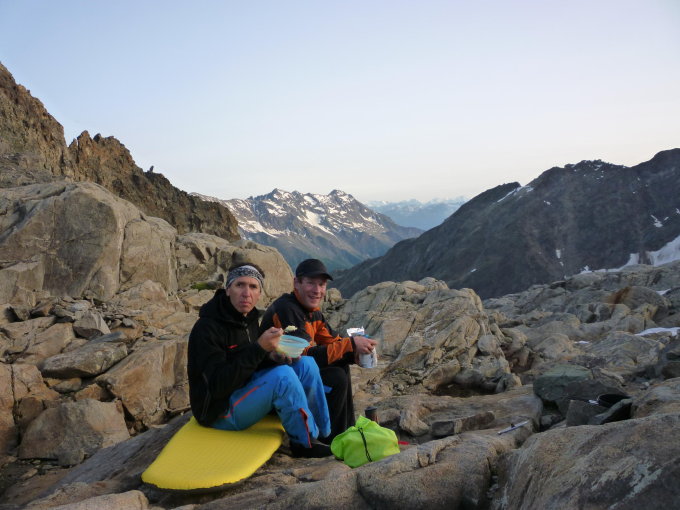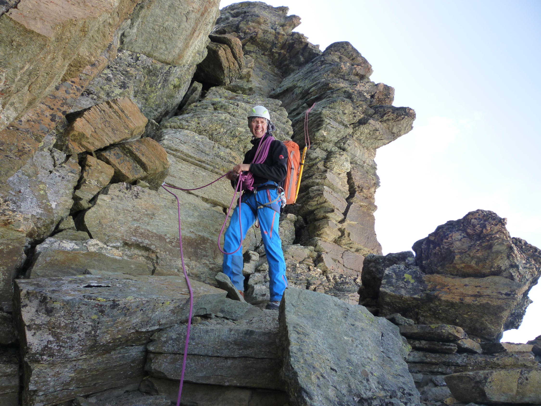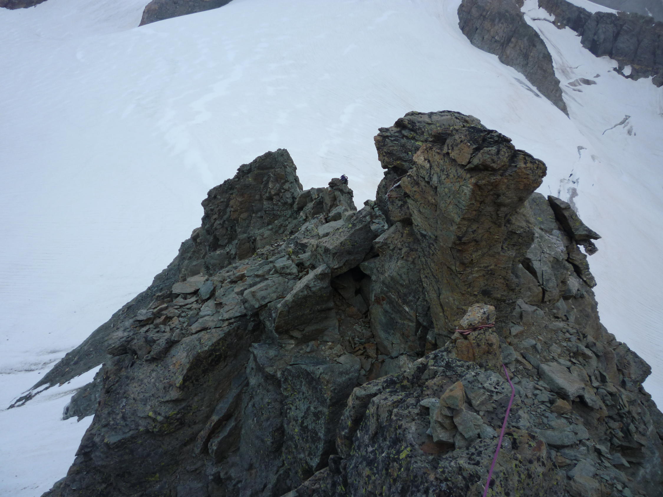 Der Westgrat ist eine sehr abwechslungsreiche Tour, die Übernachtung mit Biwak am Gletscherrand auf 2900 m ein besonderes Erlebnis. Meist sehr schöne Kletterei im 2. Grad in festen Fels, einige Schuttpassagen erfordern jedoch Aufmerksamkeit. Die Absicherung an den entscheidenden Stellen ist hervorragend, dank vieler Steigeisenspuren ist die Route sehr gut zu finden. Auch wenn keine 4000 m hoch, kann es das Lauterbrunner Breithorn mit vielen höheren Bergen an Schönheit aufnehmen. Ausser uns nur eine weitere Seilschaft am Berg!