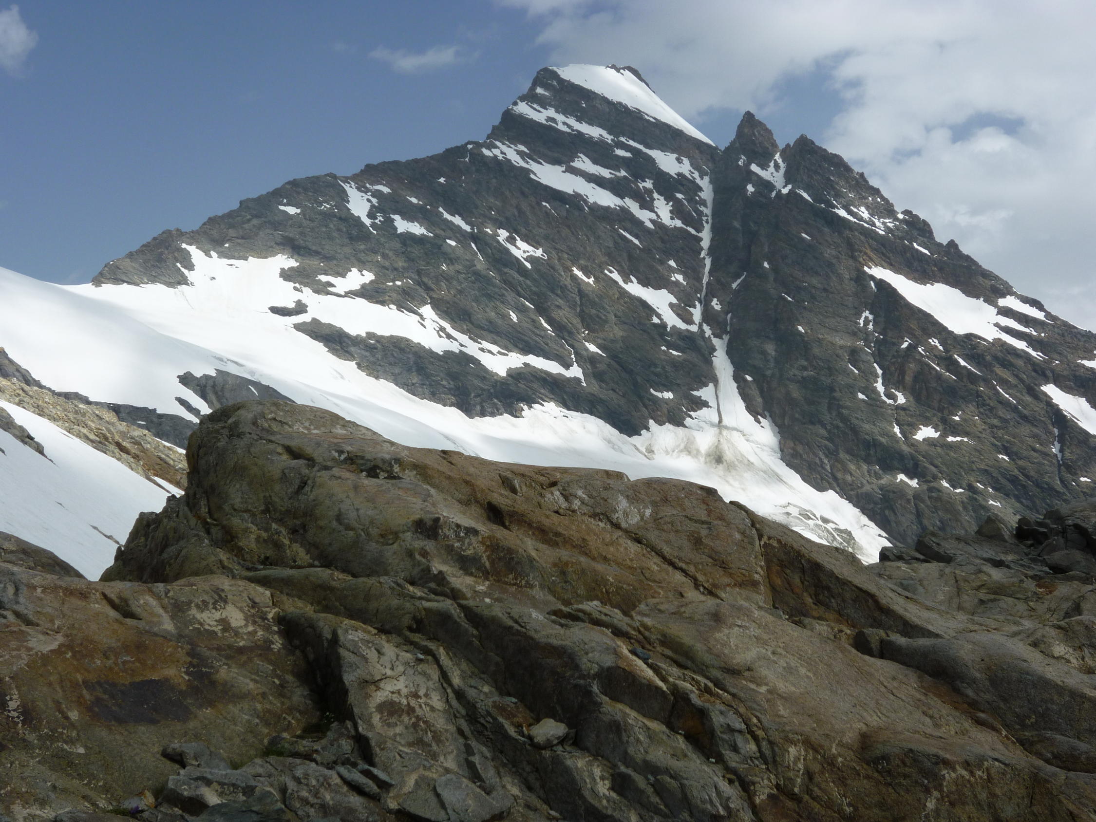 Super Verhältnisse auf der ganzen Route. Trotz hoher Temperaturen (+6 °C, 4:30, 2900 m) gutes Vorankommen über den Gletscher. Alle Spalten noch zu. Felsteil des Westgrates trocken, warmer Fels. Firngrat zum Gipfel tragend. Gegen 4:30 zog eine Störung von Südwesten durch, diese brachte kurz wenig Niederschlag, anschließend Wetter bis gegen Mittag meist stark bedeckt, ab Mittag schön. Gletscher im Abstieg um 13:00 unverändert gut.
