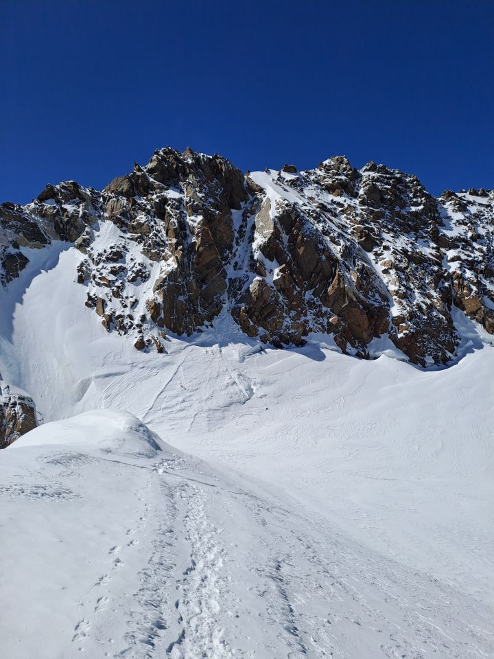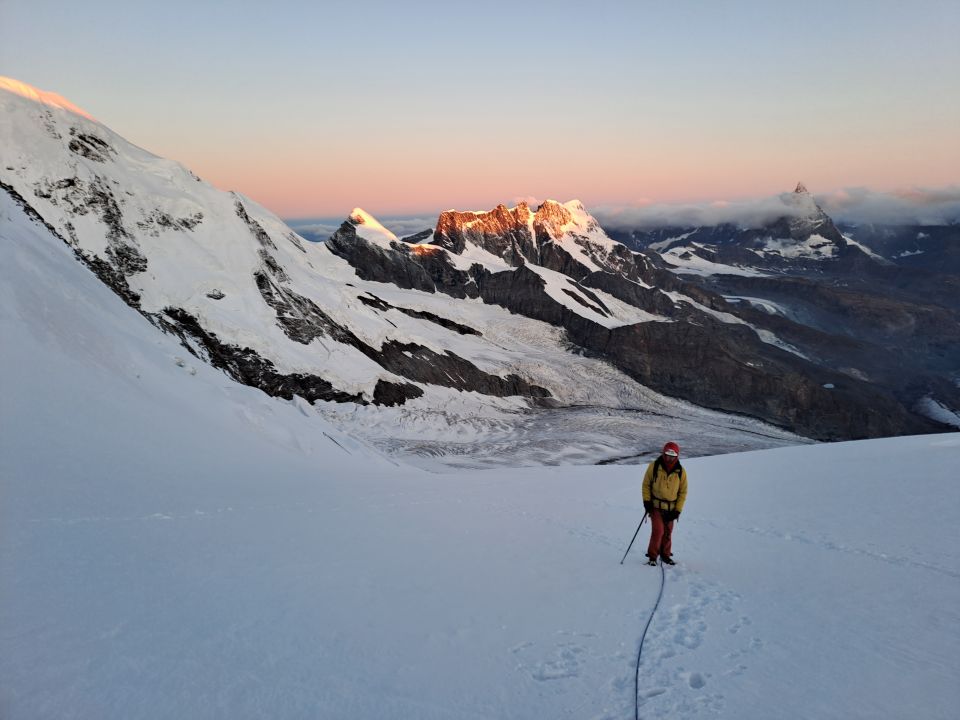 Der Gletscher ist ausgezeichnet zu gehen. Auch der Bergschrund vor Punkt 4356 ist unproblematisch. Die beiden Aufschwünge sind recht hart, aber je mehr Leute gehen, desto besser werden die Tritte. Eisschrauben hat niemand gesetzt.