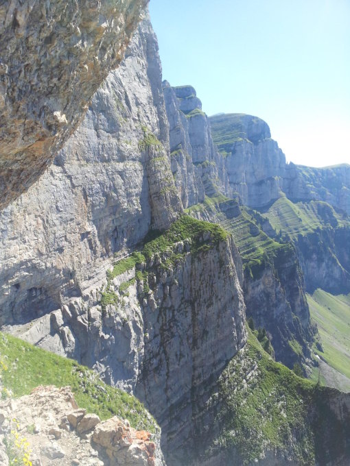 Der Zustieg übers ausgesetzte Band braucht etwas Nerven. Mit der nötigen Aufmerksamkeit und Respekt geht es aber gut. Die schwierigeren Stellen sind mit Stahl und Bergseilen gesichert. T6.