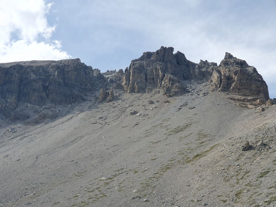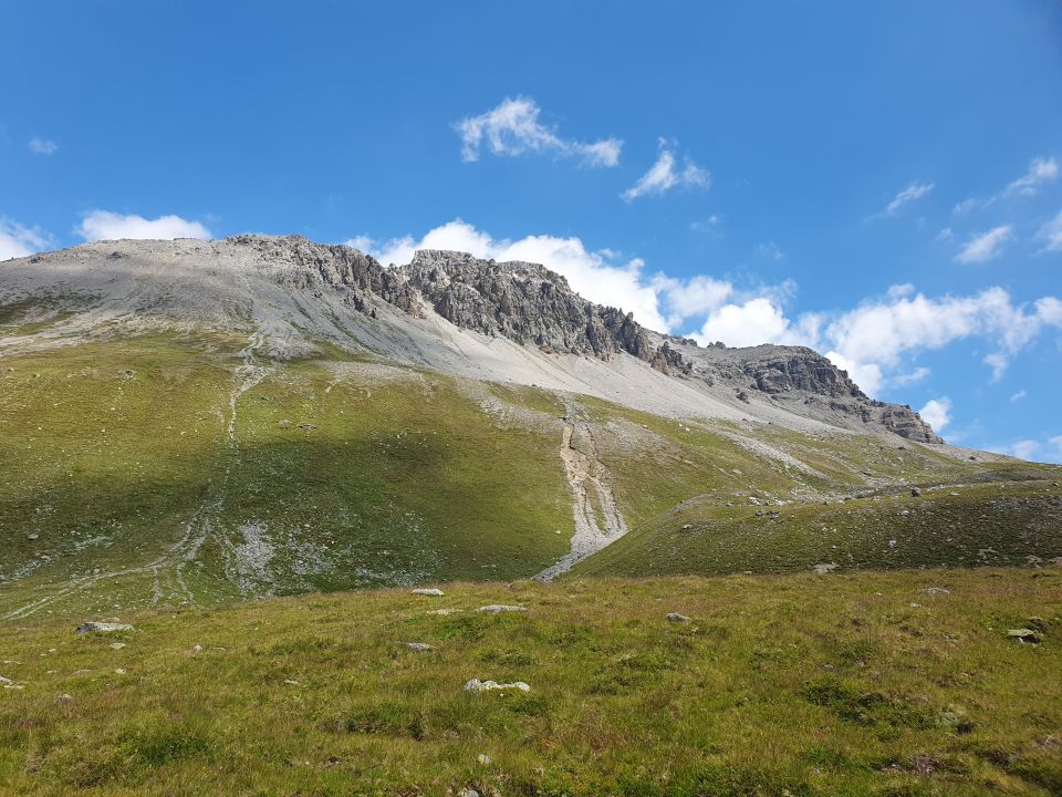 Nun zu Fuss einfach, zuerst auf dem Wanderweg, danach weglos in das Val da Costainas hoch zur Fuorcla da Starlex. Trotz ein paar Regentropfen, Wind und eher schlechtere Wetterprognosen haben wir das steile schuttige Couloir in Angriff genommen. Die Tropfen haben zum Glück kurz danach nachgelassen und im Couloir hatte es auch keinen Wind mehr, was das Kind einen Schub an Erleichterung und Motivation spendete. Der ab der Fuorcla Starlex noch immer markierte "Wanderweg" hatte auch schon bessere Zeiten hinter sich, darum habe ich für diese Tour die Anforderungen von einem (T2), was zuoberst völlig unrealistisch war, zu einem (T5-,I) angepasst. Die Traverse zum Couloir bei der Schwarzen Wand weist nur noch schwache Fussspuren im Geröll auf. Nach einer ersten kurzen Klettereinheit im I-er Bereich und einer weiteren kurzen mühsamen Traverse ins eigentliche S-Couloir geht's meist weglos in steilem Schutt hoch bis zum SW-Grat (T5-, I). Der markierte Weg ist wegen den Steinabgängen nicht mehr überall begehbar; man wähle hier vor Ort die geeignetste Variante, obwohl alle steinschlaggefährdet sind und dies den Aufstieg etwas mühsam macht.