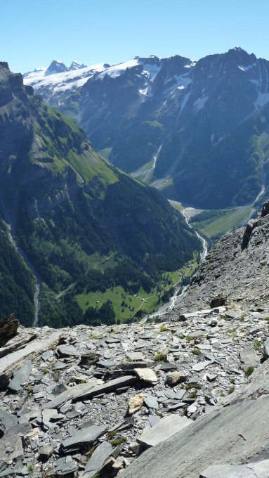 Direkter Abstieg zur Gfellalp nur mit Helm empfehlenswert. Wenn mehrere Personen in der Route (oder Steinböcke) wird es mit dem Steinschlag schnell ziemlich ungemütlich.