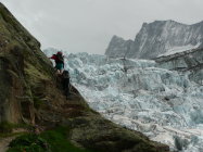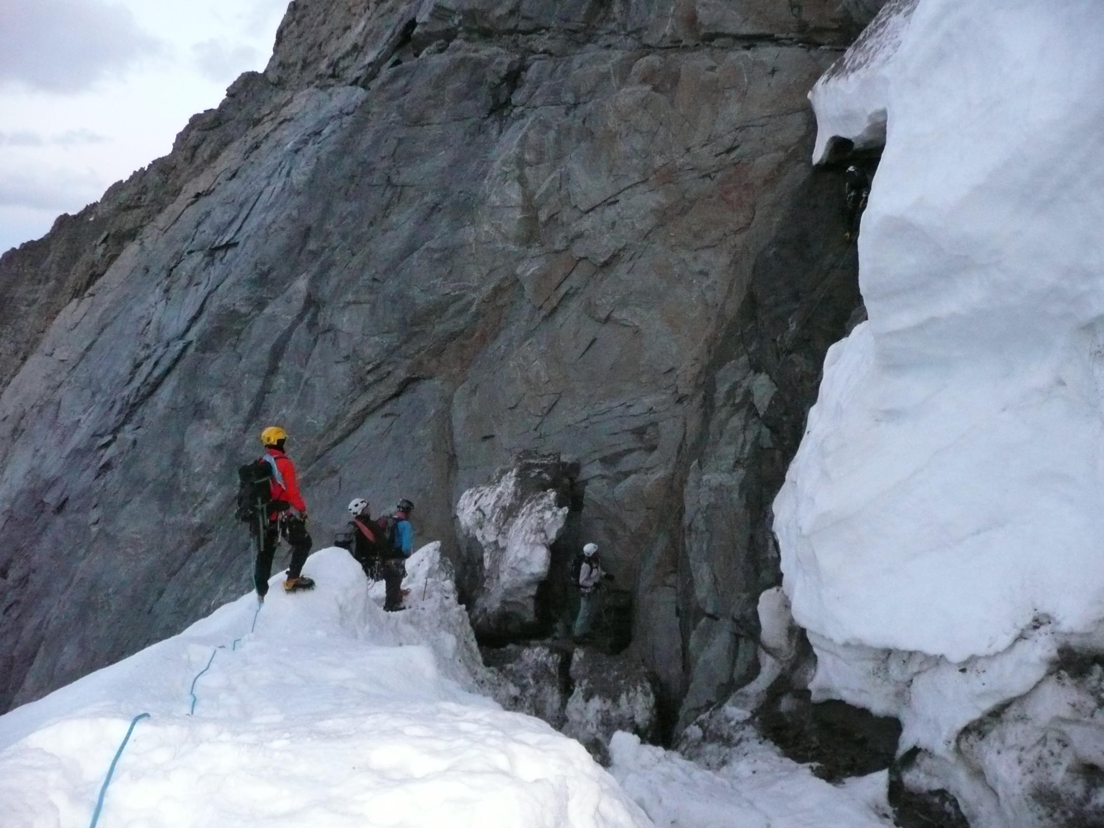 Bergschrund ist offen. Wir brauchten für seine Überwindung über eine Stunde. Eine Seilschaft ging ganz links in den Felsplatten hoch (S). Die anderen zwei fanden einen Durchschlupf etwa 300 m rechts in einer Steinschlagrinne. Sie traversierten dann oberhalb des Schrundes nach links, um anschliessend mit leichtem Abstieg die Rampe Richtung Schulter des Schreckhorns zu gewinnen. Ansonsten gute Verhältnisse mit aperem Fels.