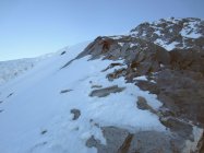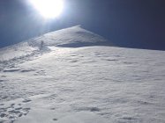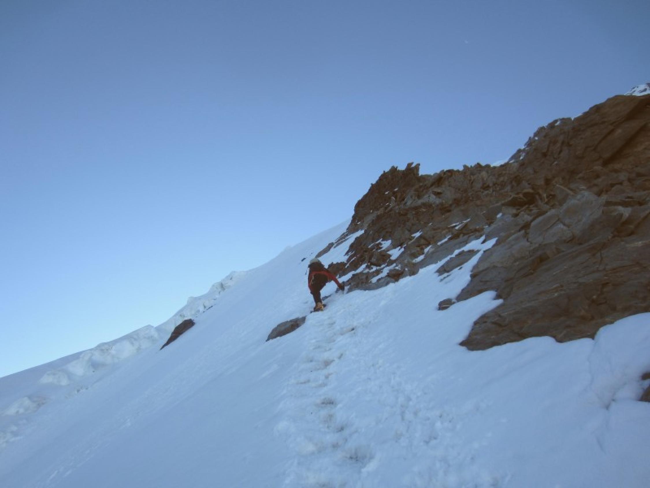Im mittleren Teil hat es nur noch wenig Trittschnee. Mit der anhaltend warmen Witterung werden sich die Verhältnisse vermutlich verschlechtern, so dass ein Ausweichen auf die Normalroute von Vorteil sein wird.