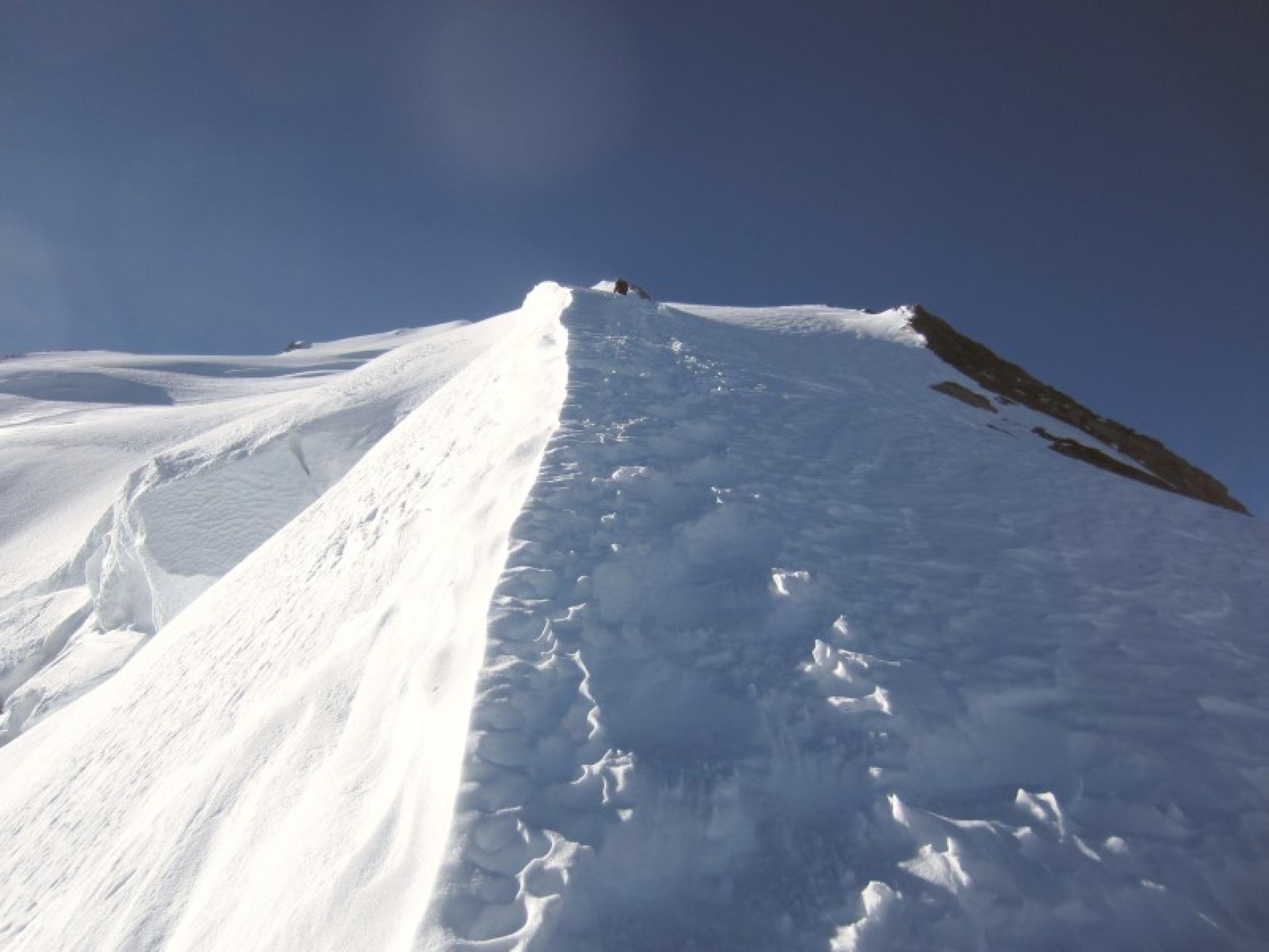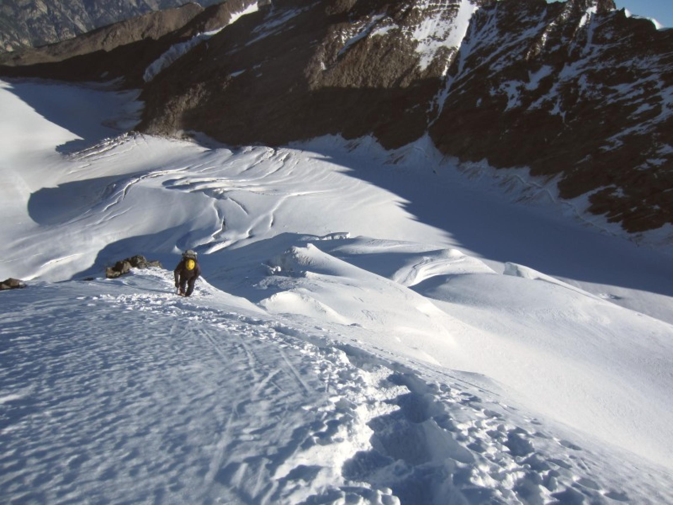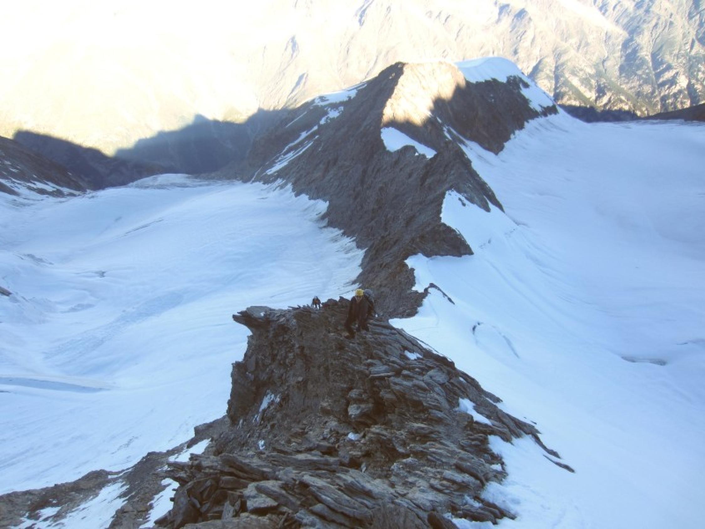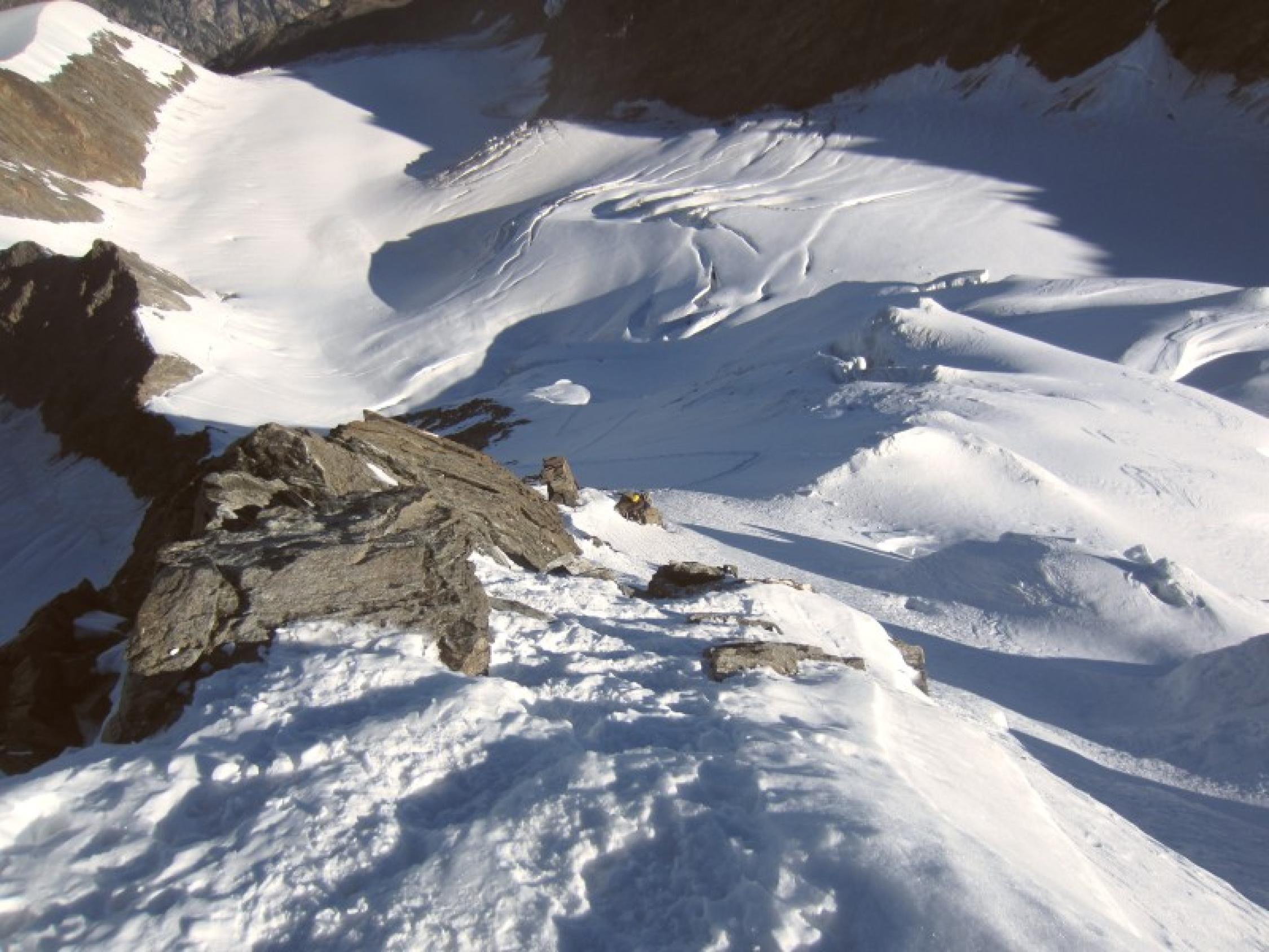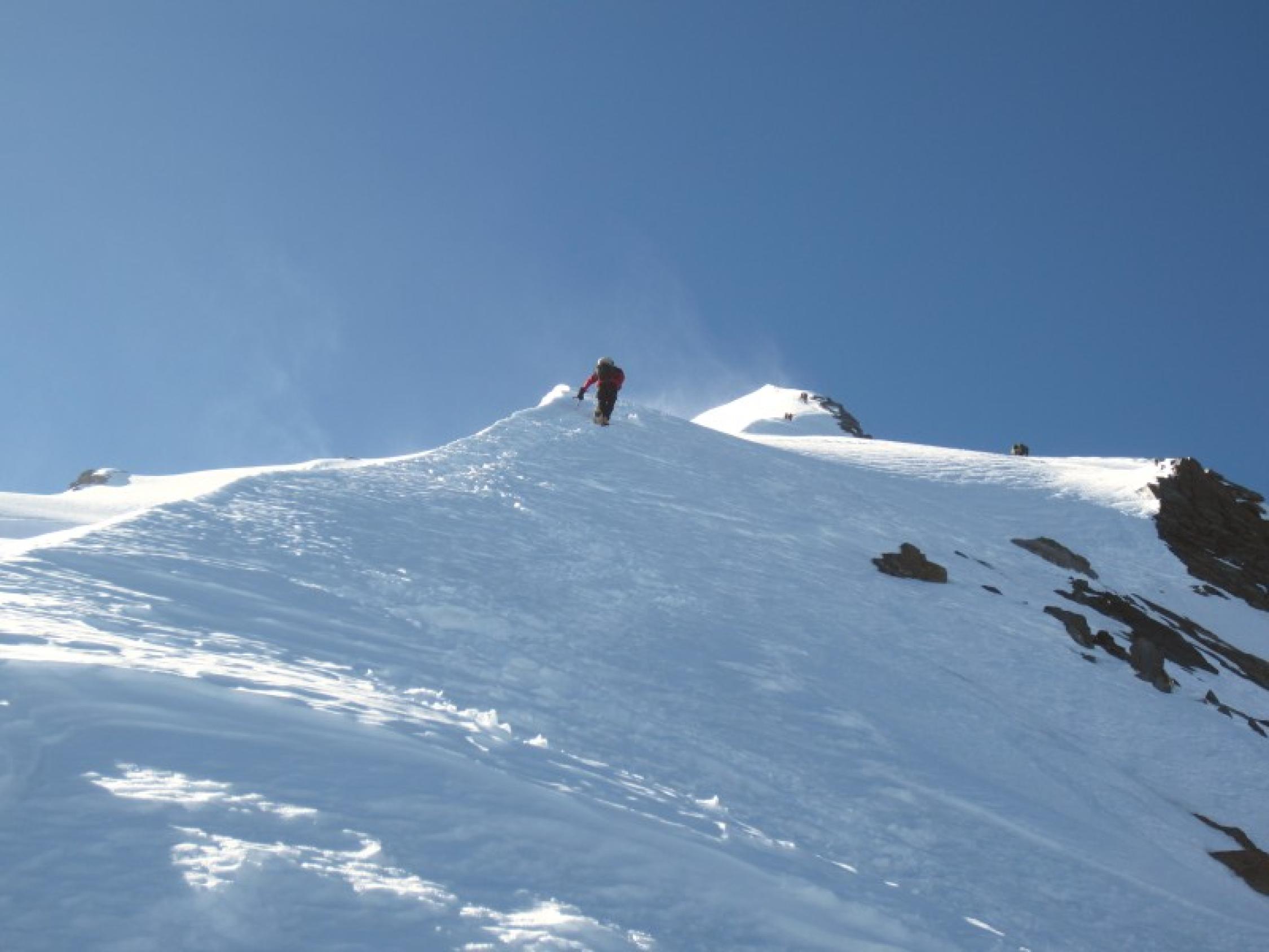 Der neue Aufstieg zum Festijoch verlangt etwas Spürsinn. Es ist wichtig, sich genau an die Route zu halten, die mit Bohrhacken ausgerüstet ist, die jedoch zum Teil nicht allzu gut zu erkennen sind. Im Moment sind noch ausgezeichnete Verhältnisse am Festigrat anzutreffen. Im unteren Teil muss mehrmals vom Firn in den Felsgrat ausgewichen werden. Der Fels ist gut gestuft und problemlos zu klettern. Im oberen Teil wird die Spur immer wieder vom Wind mit Flugschnee zugedeckt. Die Normalroute im Abstieg ist wegen des weiten Bogens um die Eisbrüche sehr lang.
