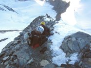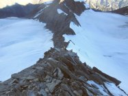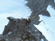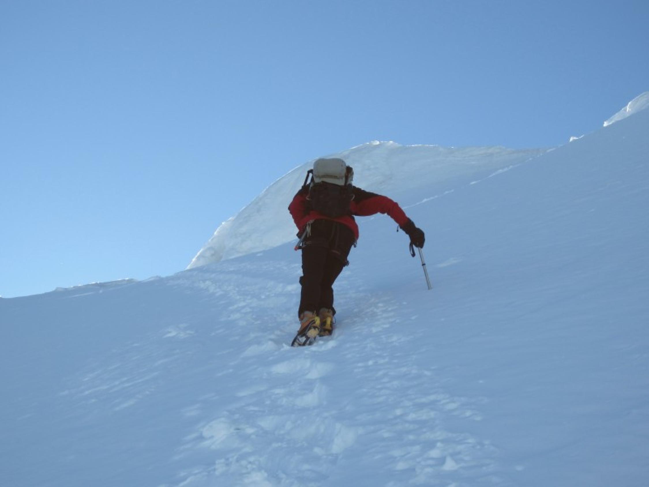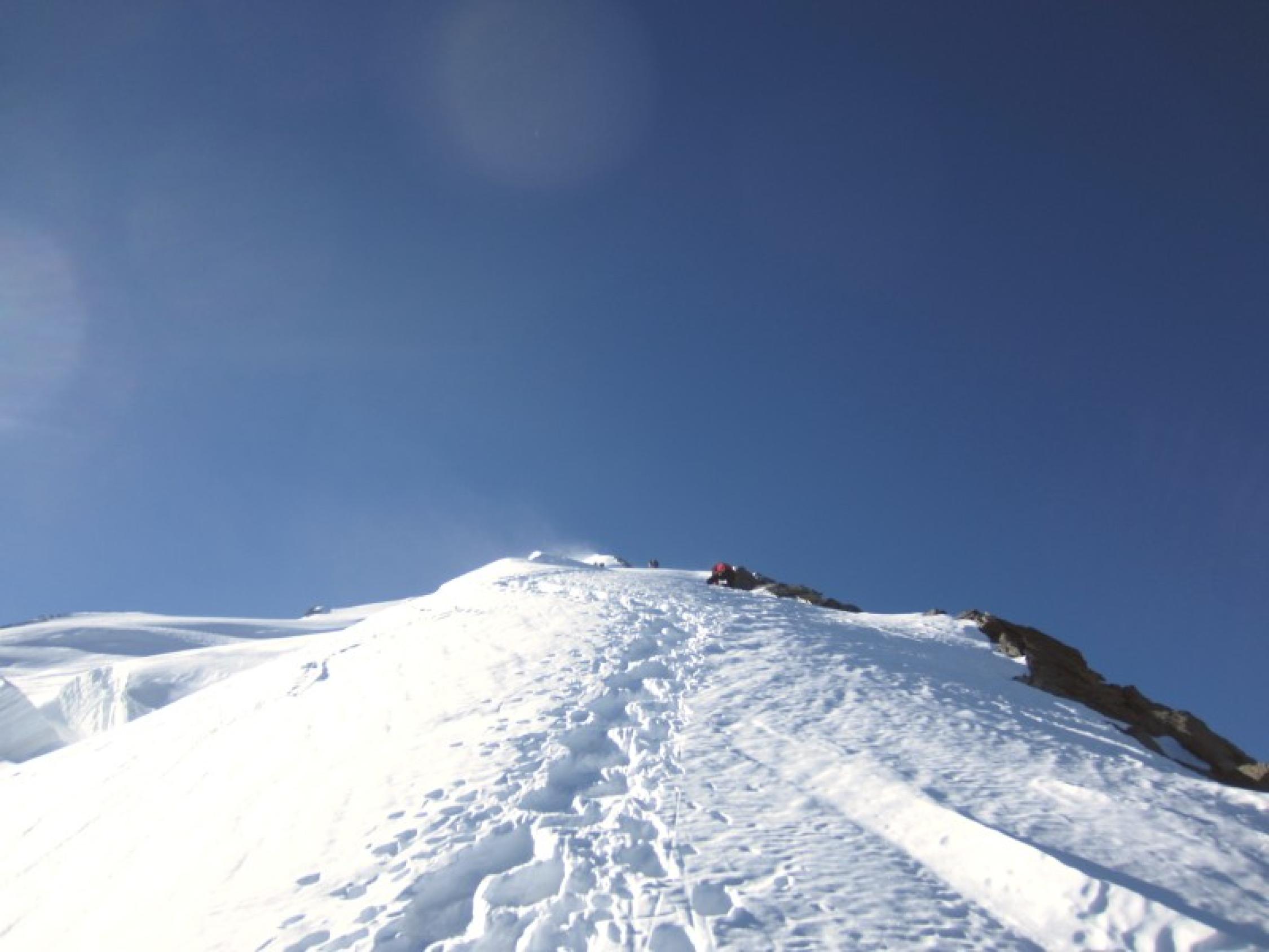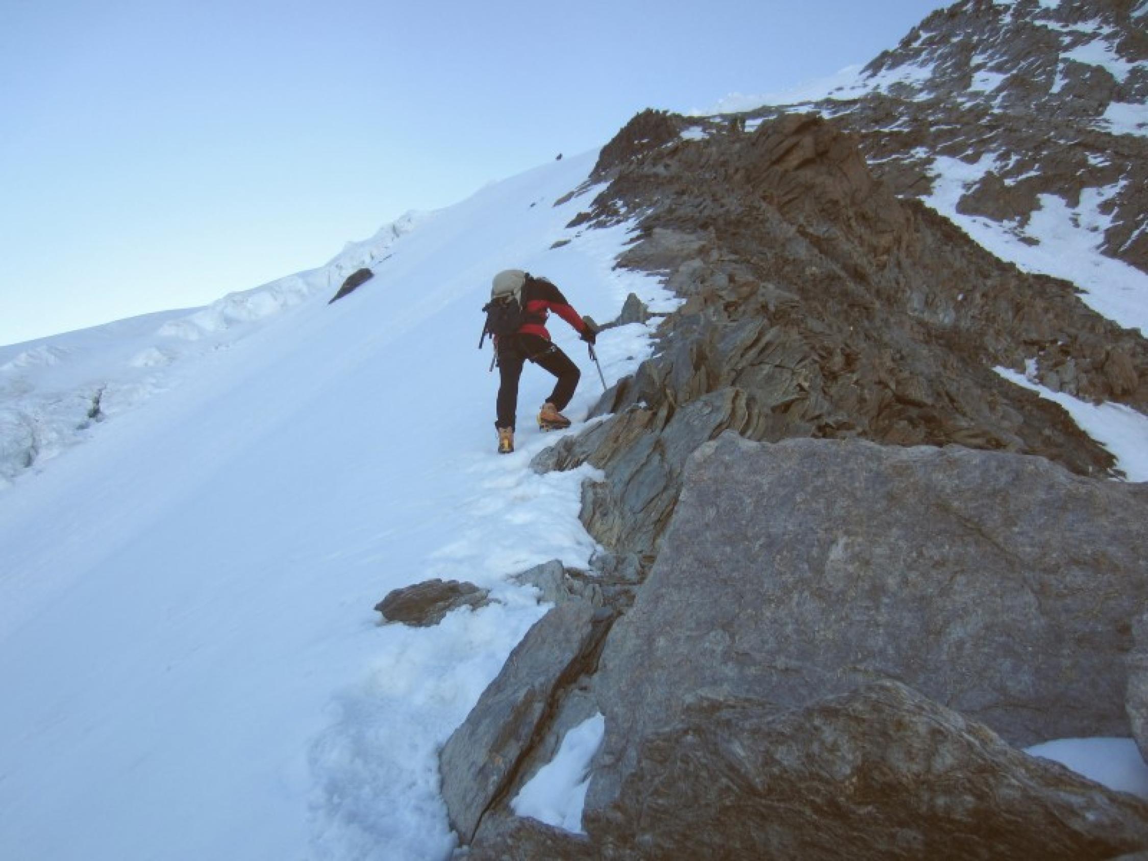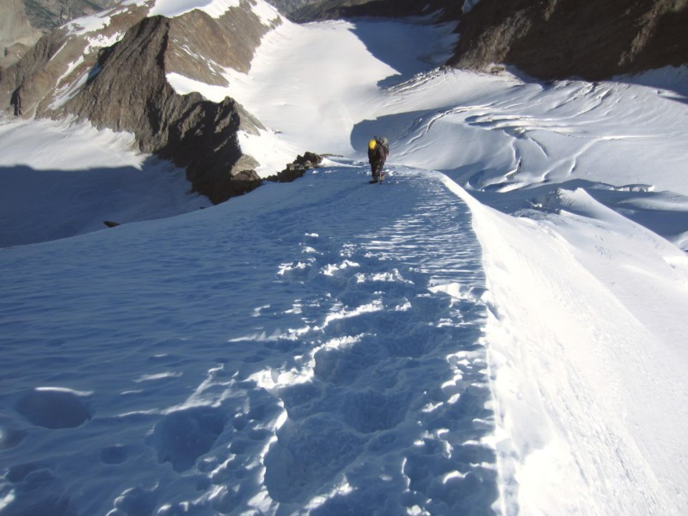 Der neue Aufstieg zum Festijoch verlangt etwas Spürsinn. Es ist wichtig, sich genau an die Route zu halten, die mit Bohrhacken ausgerüstet ist, die jedoch zum Teil nicht allzu gut zu erkennen sind. Im Moment sind noch ausgezeichnete Verhältnisse am Festigrat anzutreffen. Im unteren Teil muss mehrmals vom Firn in den Felsgrat ausgewichen werden. Der Fels ist gut gestuft und problemlos zu klettern. Im oberen Teil wird die Spur immer wieder vom Wind mit Flugschnee zugedeckt. Die Normalroute im Abstieg ist wegen des weiten Bogens um die Eisbrüche sehr lang.