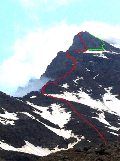 Der Abstieg ueber das Couloir du Gardien ist im oberen Teil blank und wurde gemaess fremden Informationen zum Abseilen eingerichtet.