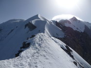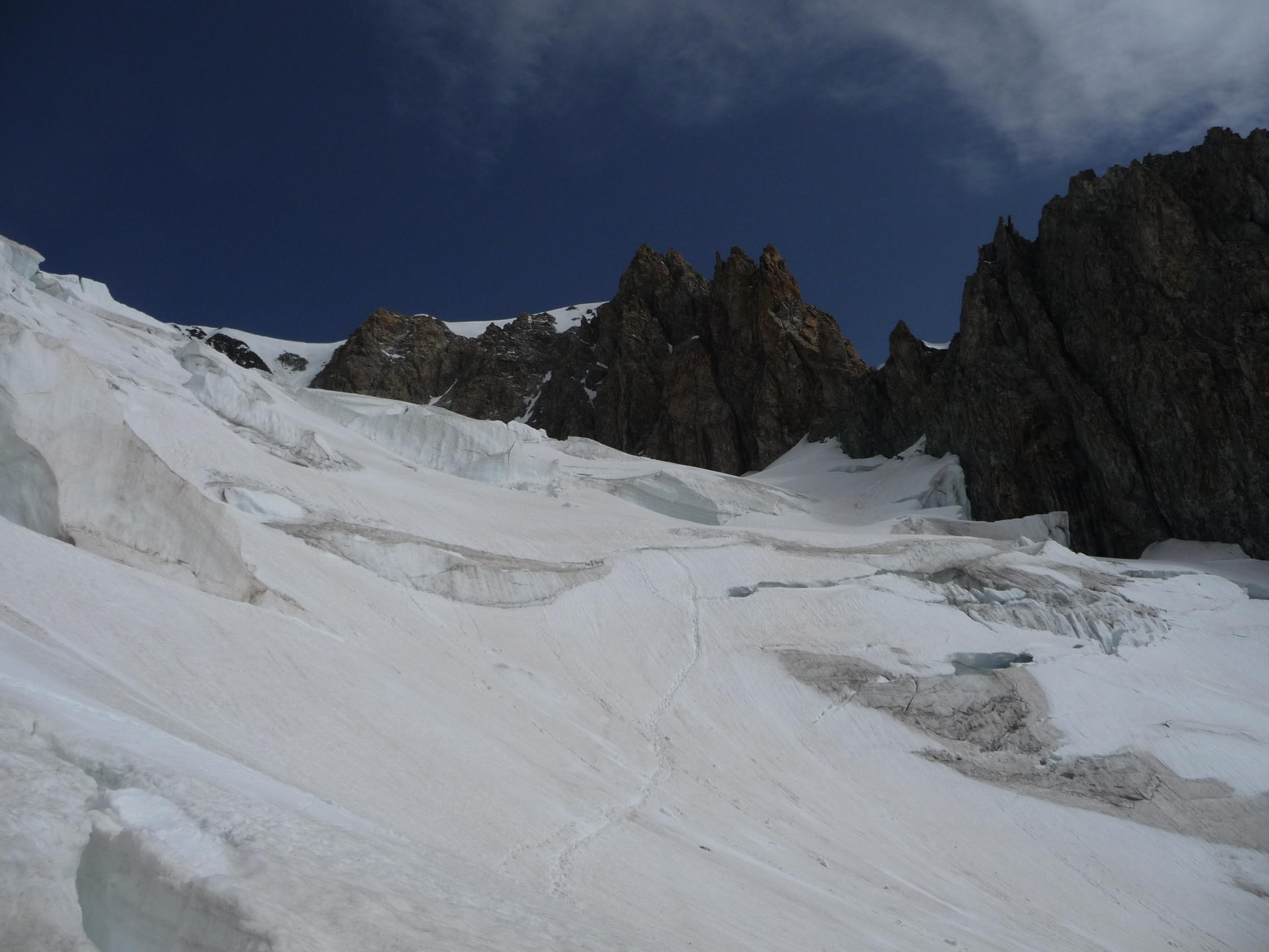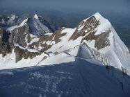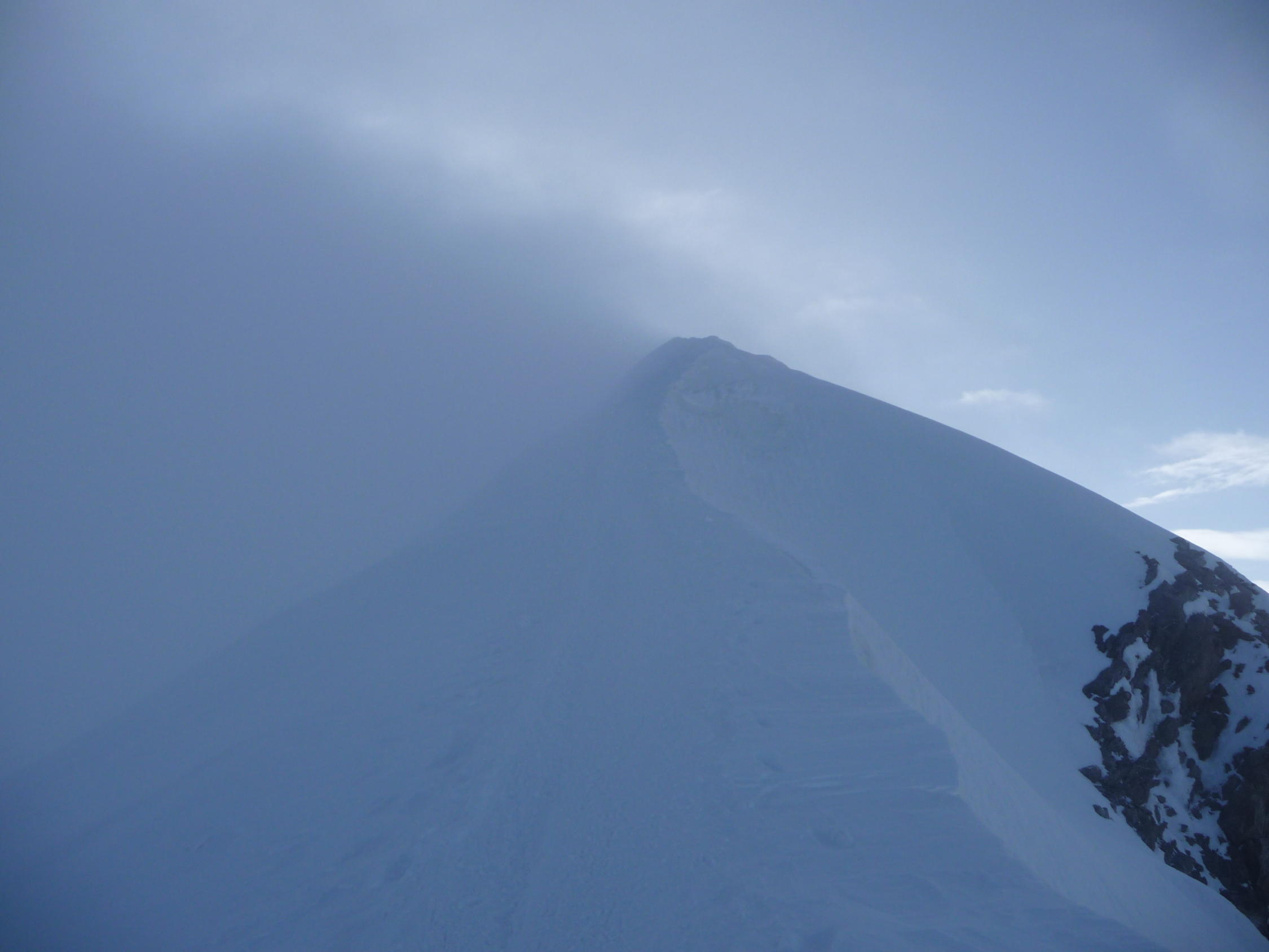 Geweckt wird um Mitternacht. Aufstieg über den Glacier du Dome noch gut eingeschneit, aber wegen hoher Temperaturen und fehlendem Gefrieren in der Nacht heikel wegen zahlreichen Spalten. Am Grat selbst perfekte Verhältnisse.