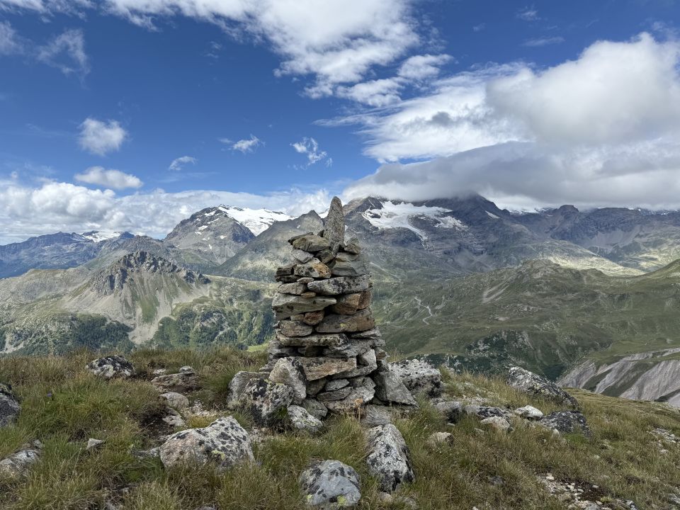 Grenztour Nordgrat Val dell Orsera ab Forcola di Livigno mit Blick zum Piz Varuna und ins Puschlav, T4-. Start Forcola di Livigno 9 Uhr (ÖV alle zwei Stunden), 9 Grad, bedeckt, Gipfel im Nebel, starker Nordwind, kalt. Alles mehr oder weniger dem Nordgrat/Rücken entlang, anfangs steil und einige Blockpassagen, gegen Ende Wegspuren. Abstieg auf nicht markiertem Weglein bis Abzweigung Monte Vago, und weiter rotweiss markiert mit einer ausgesetzten felsigen Stelle, T4-. Forcola schönes Mittagessen Rifugio Tridentina, empfehlenswert!