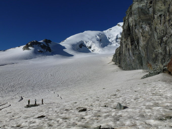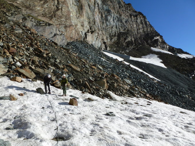 Für den Abstieg wählten wir die Normalroute über Feejoch nach Mittelallalin. Dort ist die übliche breite und gut begehbare Spur vorhanden.