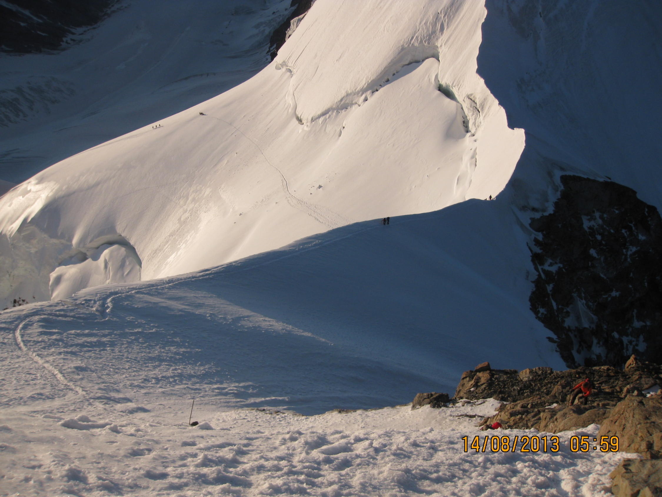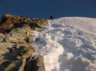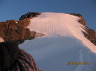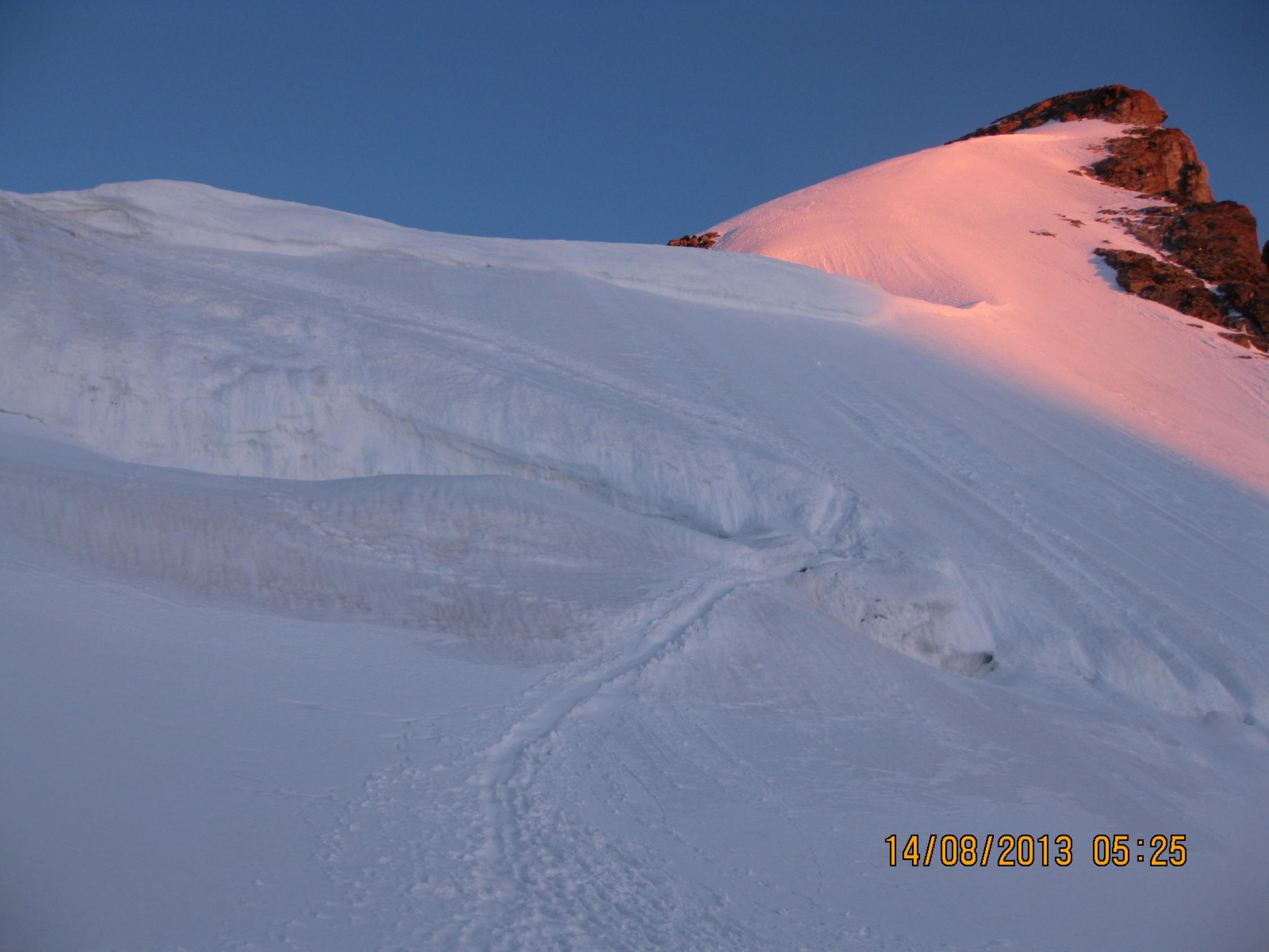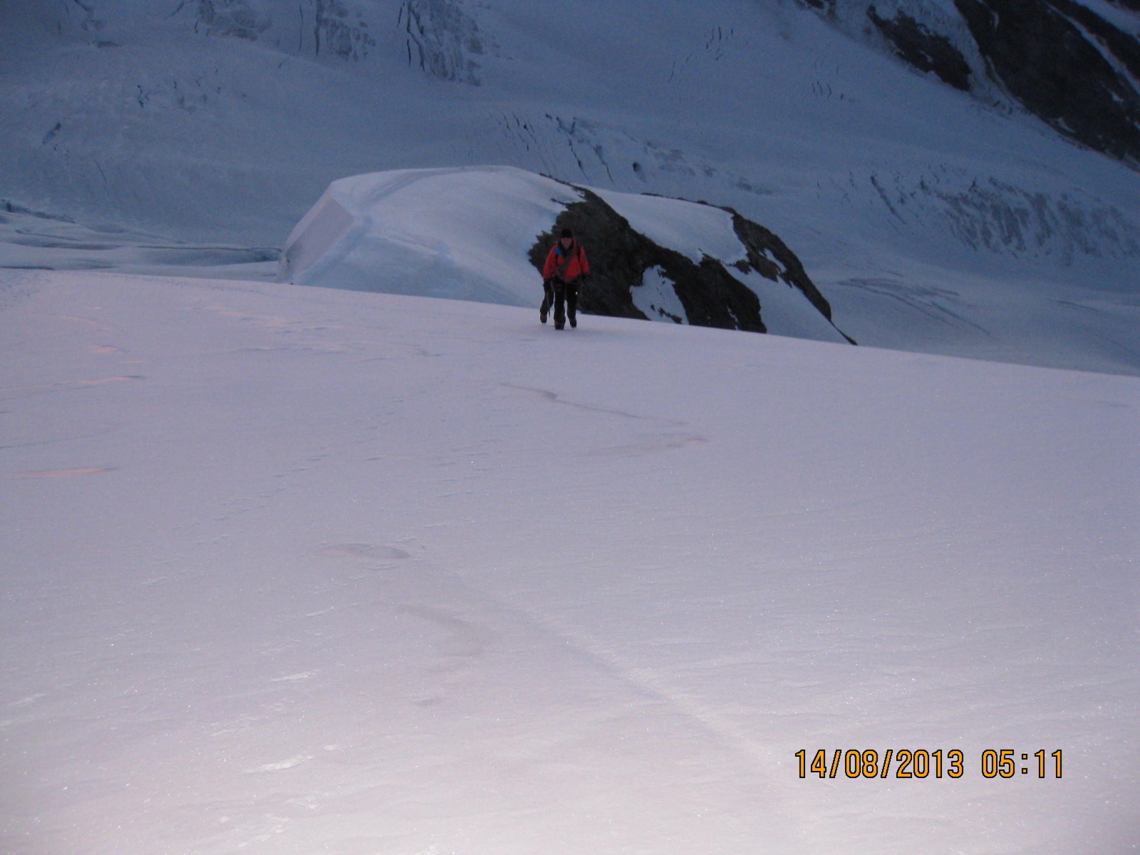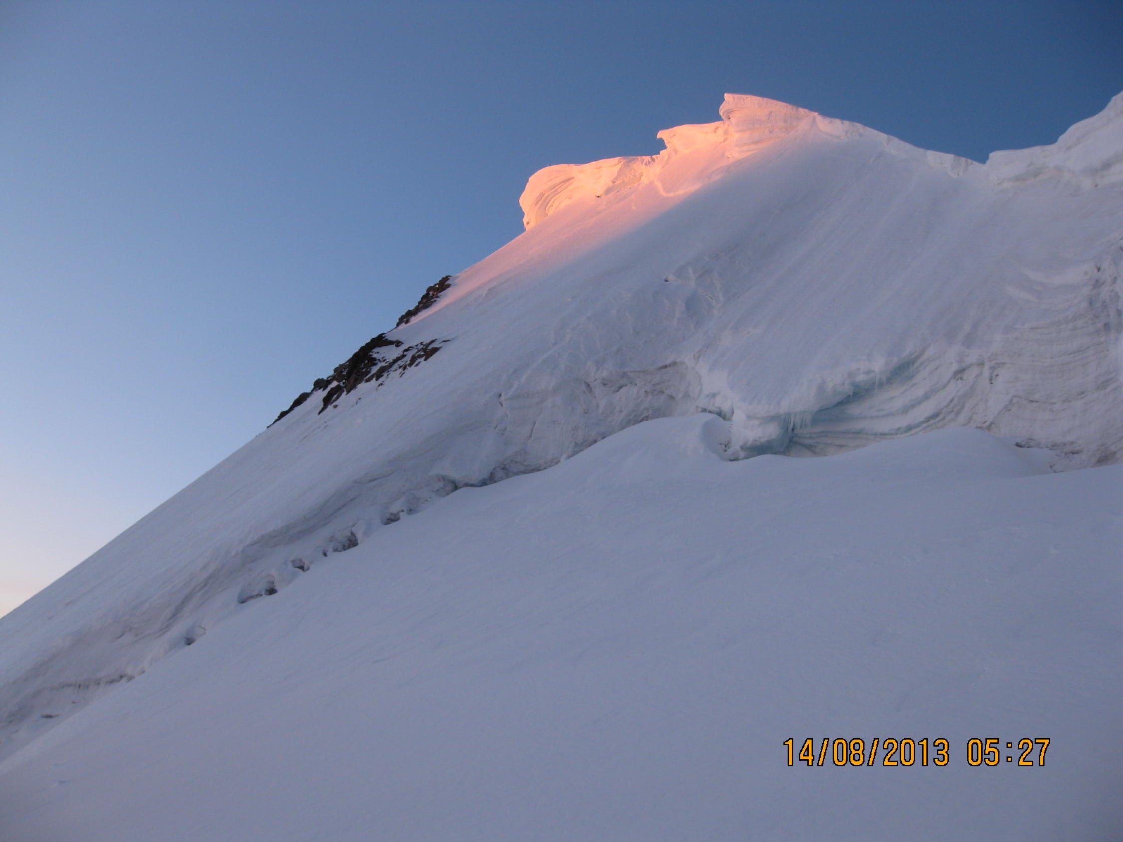 Mit den abstrahlend kalten Nächten tiptope Verhältnisse. Abmarsch Mönchsjochhütte spätestens um 4 Uhr. Bis Rottalsattel toll zu begehender Firn, unten am Sporn wenig Wassereis. Firn am Gipfelhang wird knapp, Blankeis gügslet hervor, ist aber noch griffig.