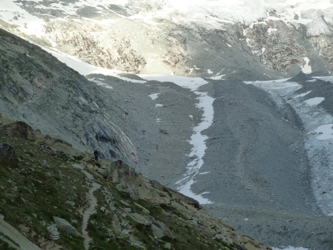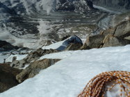 Sich dabei immer rechts der Rippe halten und dann auf Höhe des Normalwegcouloirs auf den Normalweg zurückqueren. ca. 3600-3650m.