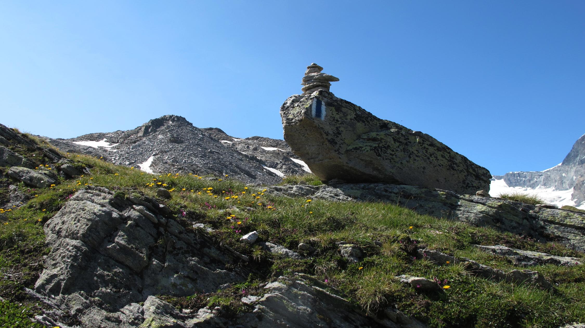 Die blau-weiss Markierungen sind frisch gestrichen und leuchten üppig in der Landschaft. Ab Pt 2704 keine Markierungen mehr, auch keine Steinmandli. Orientierung braucht etwas Spürsinn.....