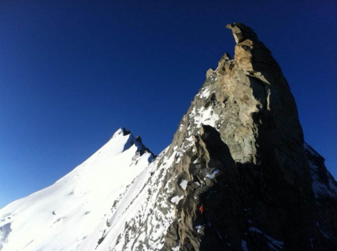 Perfekte Verhältnisse am Nordgrat. Griffiger Firn und trocken in den steilen Seillängen am Grand Gendarm. Wir haben aufgrund der Schneestellen bis vor den Grand Gendarm mit Steigeisen geklettert.